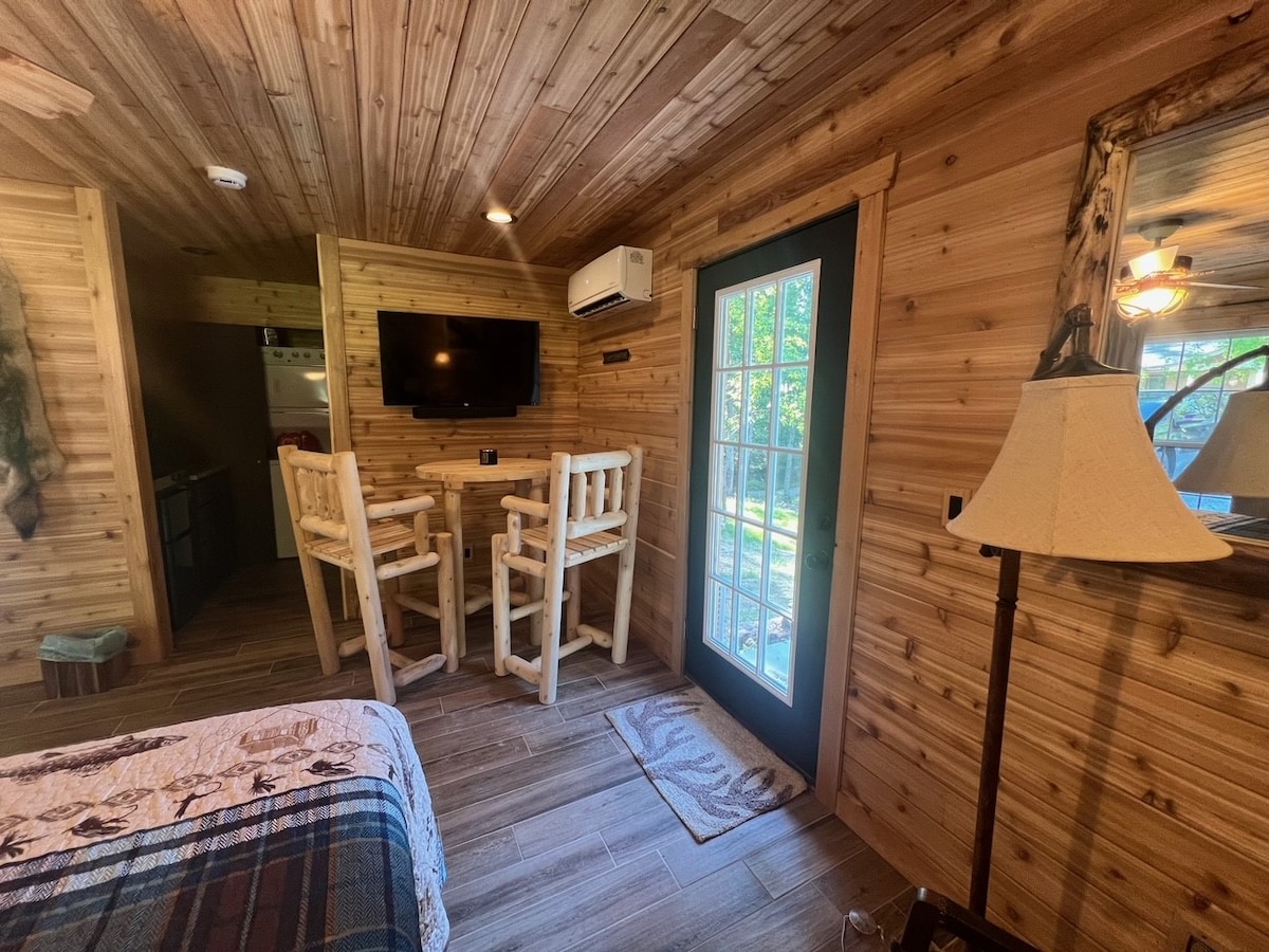 This cabin was completed in 1940 by previous owner's grandmother with only the help of her horses. The wood was cut from the property. Originally it had no electric or plumbing, we updated it more in 2021 keeping as much original as possible. Rustic cabin has 2 bedrooms, 1 bathroom with walk-in shower only, washer and dryer, full eat in kitchen and living room. On site you can relax watching horses, mini horses, goats, chickens & ducks as well as wild life. You can feed and pet the đ goats.