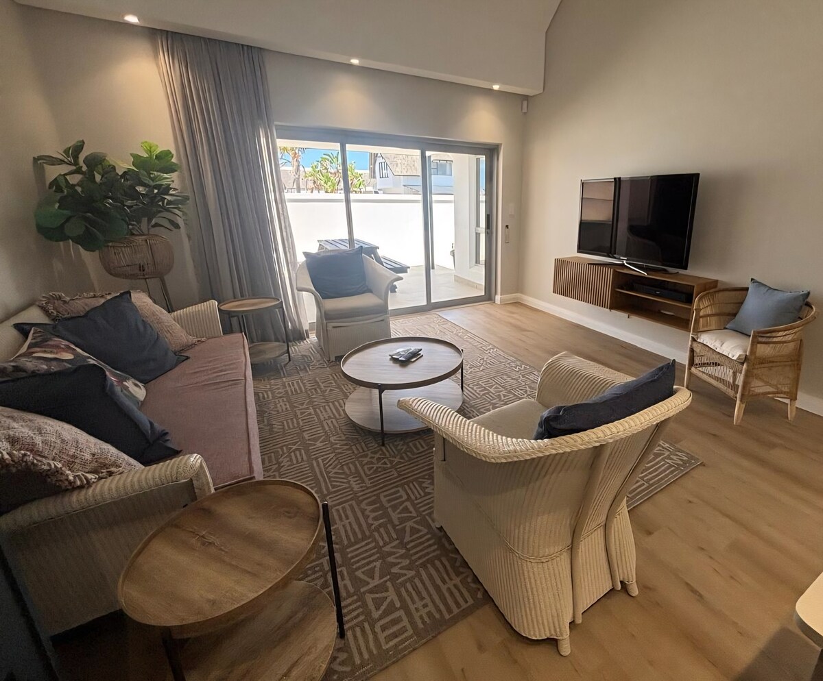 The beautiful beachfront apartment, fitted with back up power and situated close to the famous Supertubes is detached from the main house and hosts a tranquil and private space on the beach. With a 3 minute walk to a variety of restaurants and shops, the location is accessible, quiet and scenic. The kitchen is equipped for self-catering with modern appliances and a dishwasher. The lounge has direct access to and views of the beach. In a safe area with safety features and locked parking.