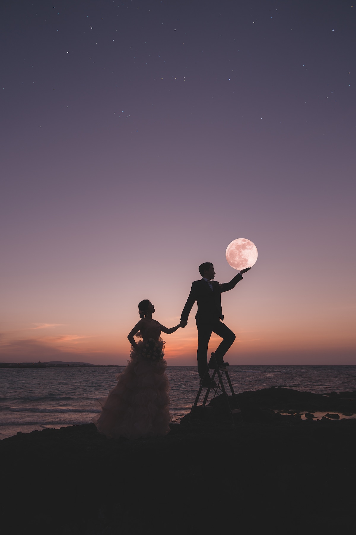 Under the moonlight of Jeju, two people in the night sky are captured in a sentimental colour scheme. (The moon will be added as a post-production effect after filming.)
