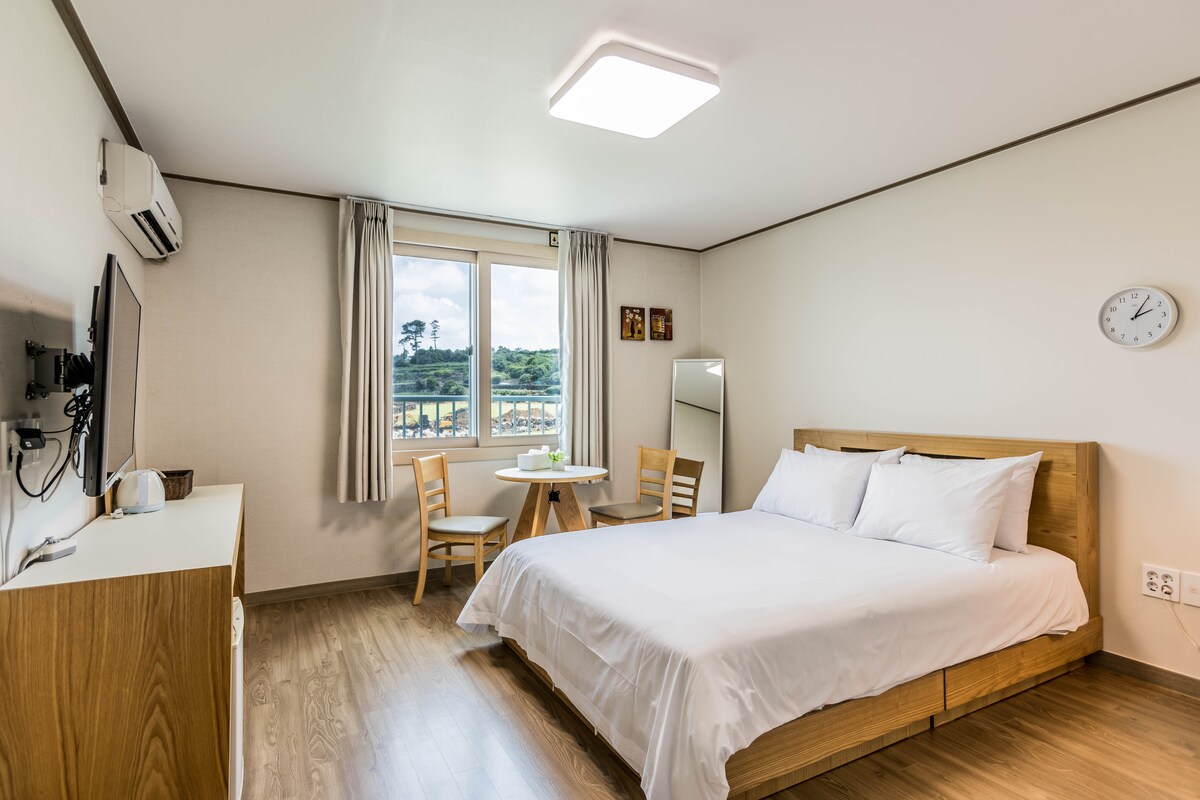 It is 15 minutes by car from the airport. It is close to the bus stop, so it is easy to get around by bus, especially to the east (towards Seongsan). The entire building is non-smoking and smoking is allowed in the parking lot outside the building. There are no smoking rooms. Each room is a private room with a private bathroom. Laundry service is available for a fee and can be collected before 11 am and delivered late afternoon.