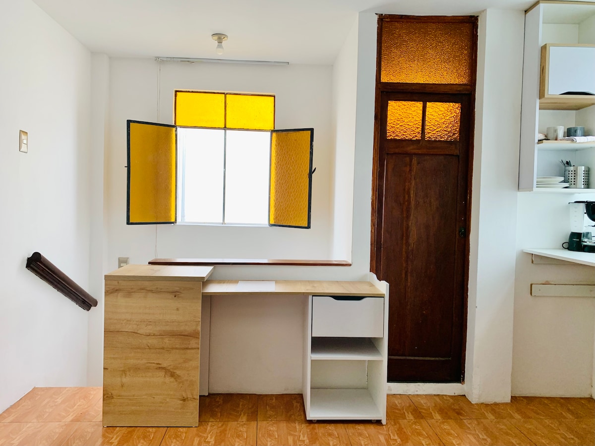 Functional studio with a double bed, bed linen, towels, large window, closet with drawers, TV, kitchenette for basic food preparation, kitchenware, table, chairs, water, electricity, national channels and internet services, it has a private bathroom with hot water for exclusive use outside the room. It is very well located in the downtown area of Pueblo Libre, separate entrance.