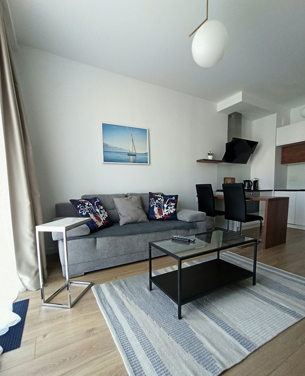 Comfortable, fully equipped apartment in a new building. A living room with an open kitchen divided into a dining and sitting area. The bedroom has a queen bed and a spacious closet. There's also a walk-in closet as an extra storage space. There are shops, restaurants and cafes in the area Equipment: air conditioning, coffee maker, kettle, iron, ironing board, washing machine Directions from Chopin Airport 20 min taxi 50 min communication from Modlin Airport 50 min taxi 120 min communication