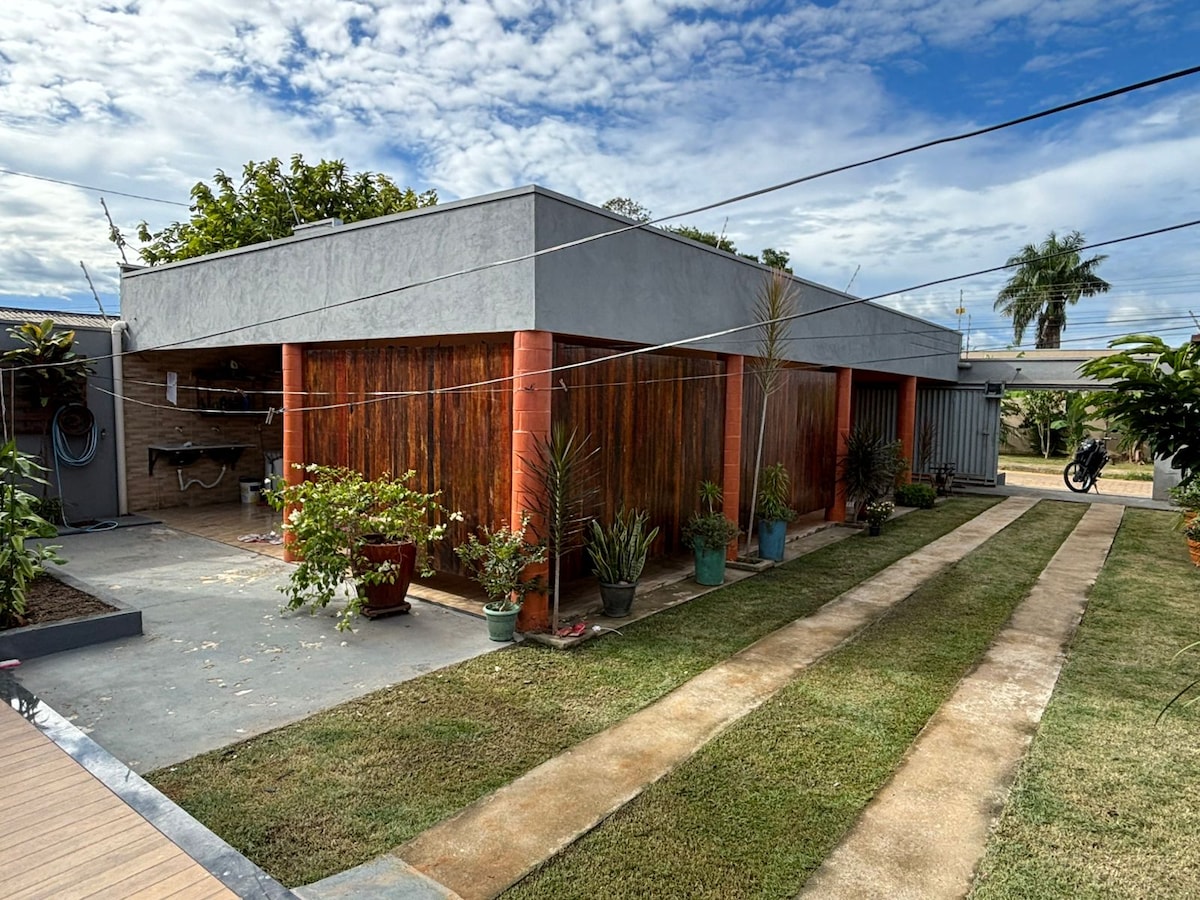 Casa nova e a 5 minutos do centro da cidade. Próxima a faculdade, hospitais e ao batalhão da PF e PM. Com cozinha planejada e sala super agradável , churrasqueira e área gourmet externa, ideal p/dias confortáveis a felizes. Ótima opção p/quem precisa de um espaço que une conforto, comodidade, privacidade e segurança. Para reservas de 1 hóspede ou casal disponibilizamos o acesso à apenas 1 quarto. Acima disso terão acesso aos 2 quartos.