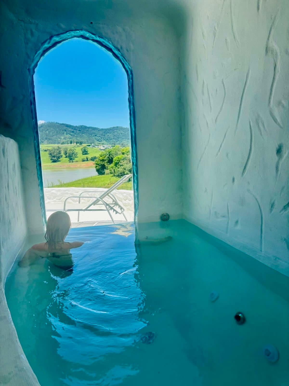 A private hot tub is positioned beside a large window, offering a view of lush greenery outside. Natural light reflects off the water's surface, creating a serene ambiance. The surrounding area features warm wooden accents, contributing to a tranquil retreat atmosphere.