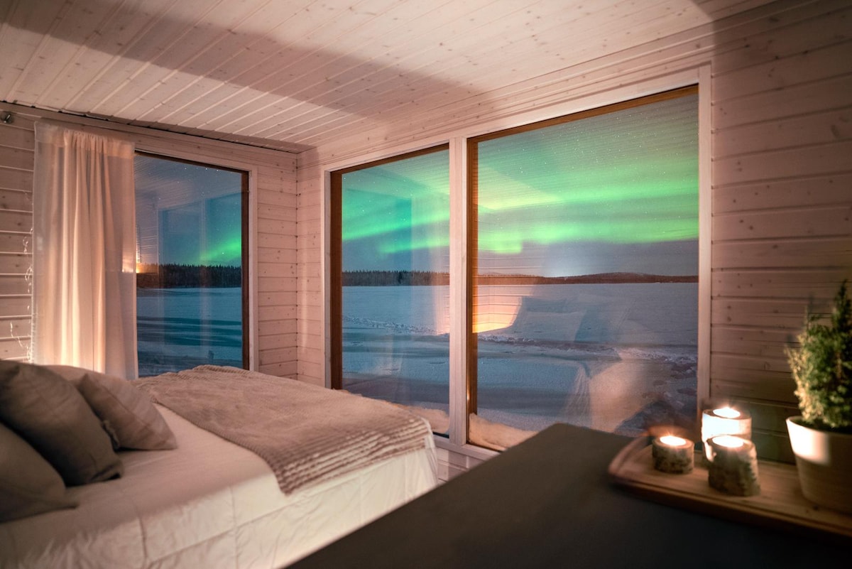 Slappna av i detta lugna boende.Här bor du i ett exklusivt, nybyggt timmerhus invid Torne älv.Boendet är i 2 plan och består av kök, stort badrum,stort allrum, 2 sovrum,SMART TV,skotork,stor uteplats både på neder-och övervåningen,uteplats vid älven.Fantastisk utsikt över Torne älv där du ser en blandning av NORRSKEN, skotrar,hundspann och vinterbadare.Det finns att boka vedeldad bastu och grillkåta, mot avgift.Gångavstånd till Icehotel,hembygdsgården, kyrkan och affär.Parkering utanför dörren.