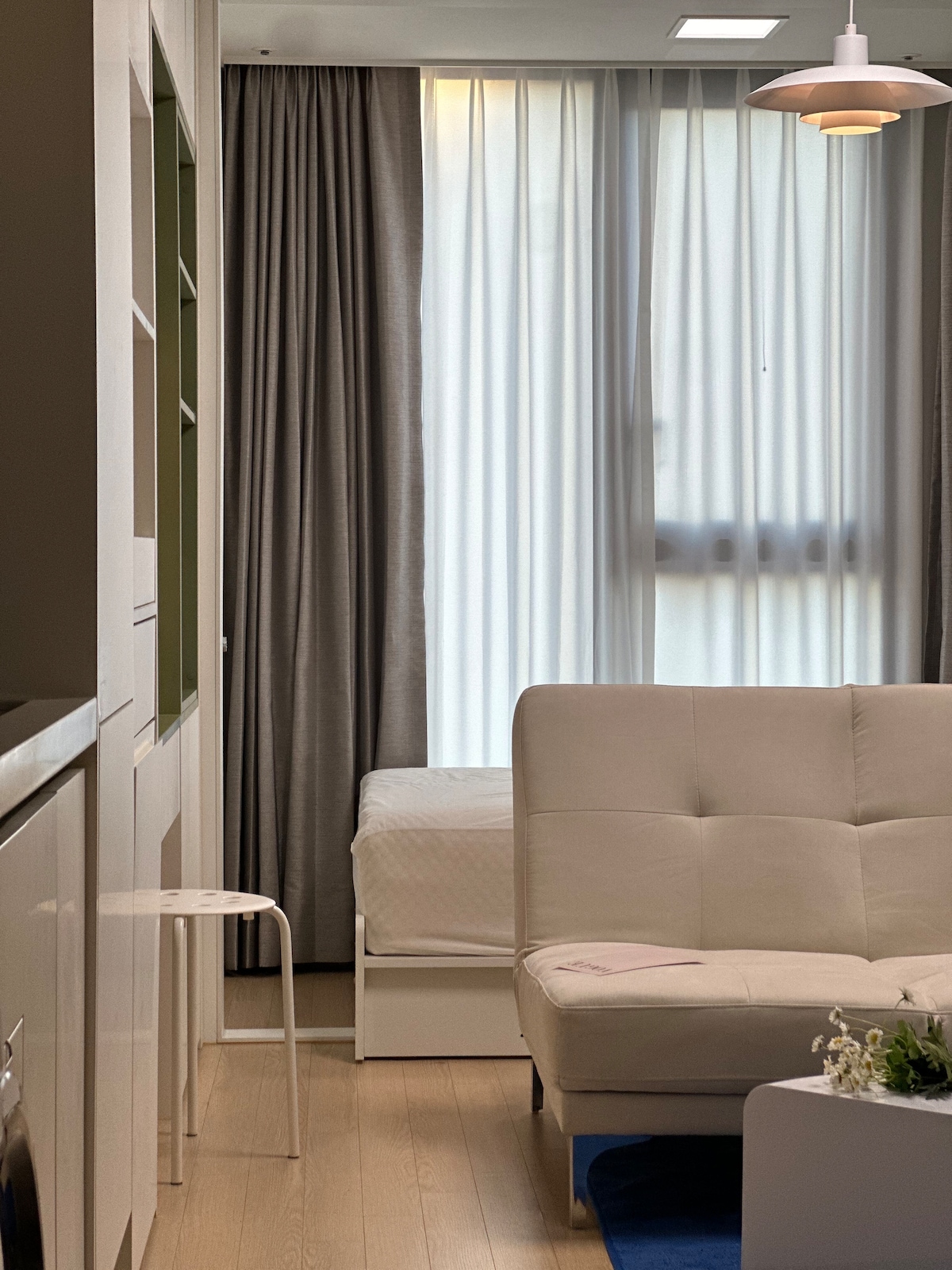 Keep it simple at this peaceful and centrally-located place. Angelina's place puts cleanliness first. The beds are queen size and sofa beds, and when the sofa bed is opened as a bed, it will be a double bed, giving you comfort without any loss of function. The bedding is sterilized at high temperatures every time, so it will help you sleep comfortably. Water purifier, washing machine are of course provided, and laundry detergent and fabric softener are also available. All tableware, salt, pepper, and oil are also available for cooking. There's probably everything you need. Please come simply.😁