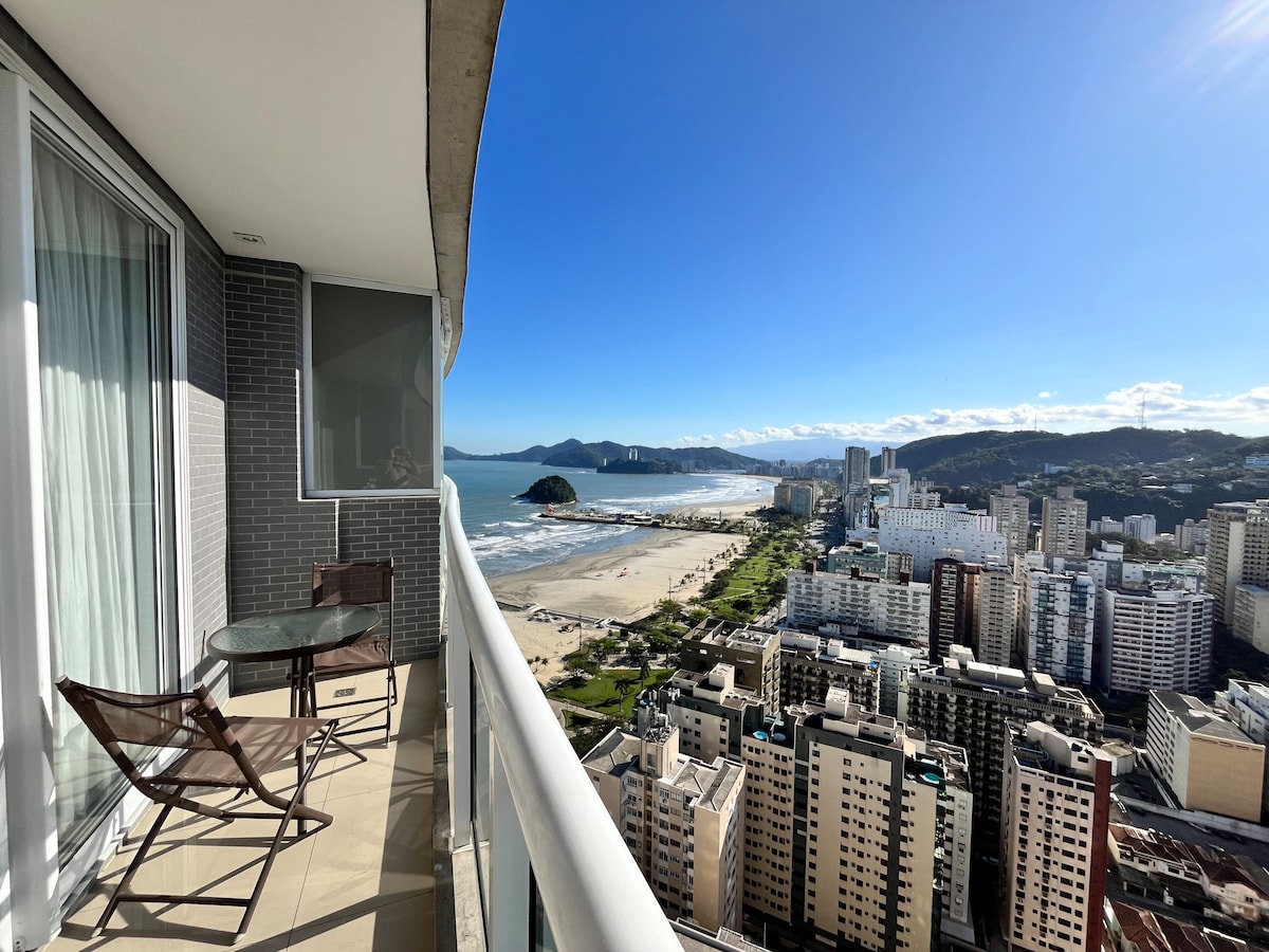 Apartment in a luxury condominium - right on the sand - very well located, close to Gonzaga. A Studio with everything you have in your home, full kitchen, living room with 4K smart TV and sofa bed, bedroom with double bed, closets, office and bar, exclusive bathroom for you and all this with air-conditioning and balcony overlooking the famous gardens of the Santos beach shore.