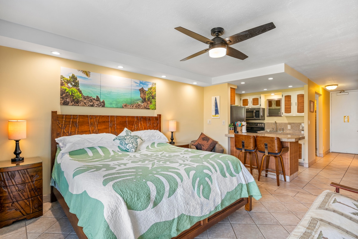 Welcome to Lahaina Shores 526, a fully renovated oceanfront studio offering breathtaking West Maui Mountain views. Located in the beloved Lahaina Shores Beach Resort, this peaceful sanctuary by the sea invites you to relax and reconnect with Maui’s natural beauty. Enjoy a king-size bed, fully equipped kitchen, smart TV, cable TV, air conditioning, and your own private lanai overlooking the mountains. The resort features an oceanfront pool, hot tub, BBQ grills, and lush tropical grounds.