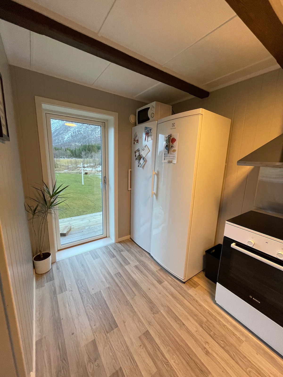 Enjoy your stay in Lofoten in a fishermans cabin with everything you need. The cabin is new, modern, and lays right by the ocean and mountains. The cabin is equipped with everything you need, with a large, fully equipped kitchen, four bedrooms, a living room with a beautiful view, 1,5 bathrooms with shower and washing machine, and a dining room with room for the whole family. Nice fireplace in the livingroom on the second floor.
