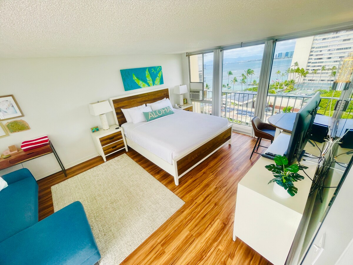 NEW! Waikiki City View Studio. This newly renovated studio offers 382 sq. ft. of stylish living space with a spacious lanai, where you can enjoy breathtaking city&Koolau mountain views and enjoy your meal. Sleeping Arrangements: • King-size bed for ultimate comfort • Two twin-size Japanese-style futons Kitchenette Amenities: • Electric kettle with complimentary ground coffee and hibiscus tea • Portable induction stovetop for light cooking • Dinner plates, bowls, microwave, and wine cellar
