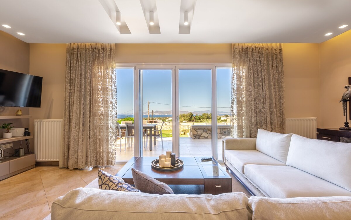 A beautiful villa of 3 bedrooms with a 6m heated swimming pool and amazing sea view!It has modern boho style and it's ideal for people who want to relax. It has fully equipped kitchen, 3 bathrooms, living room with wood stove and a loft with a 65 inch Sony home cinema. All bedrooms are equipped with COCO-MAT sleep products, handcrafted from natural materials. Armonia, is a new addition in Petra Boutique Homes with facilities and services designed to ensure more than a comfortable stay.