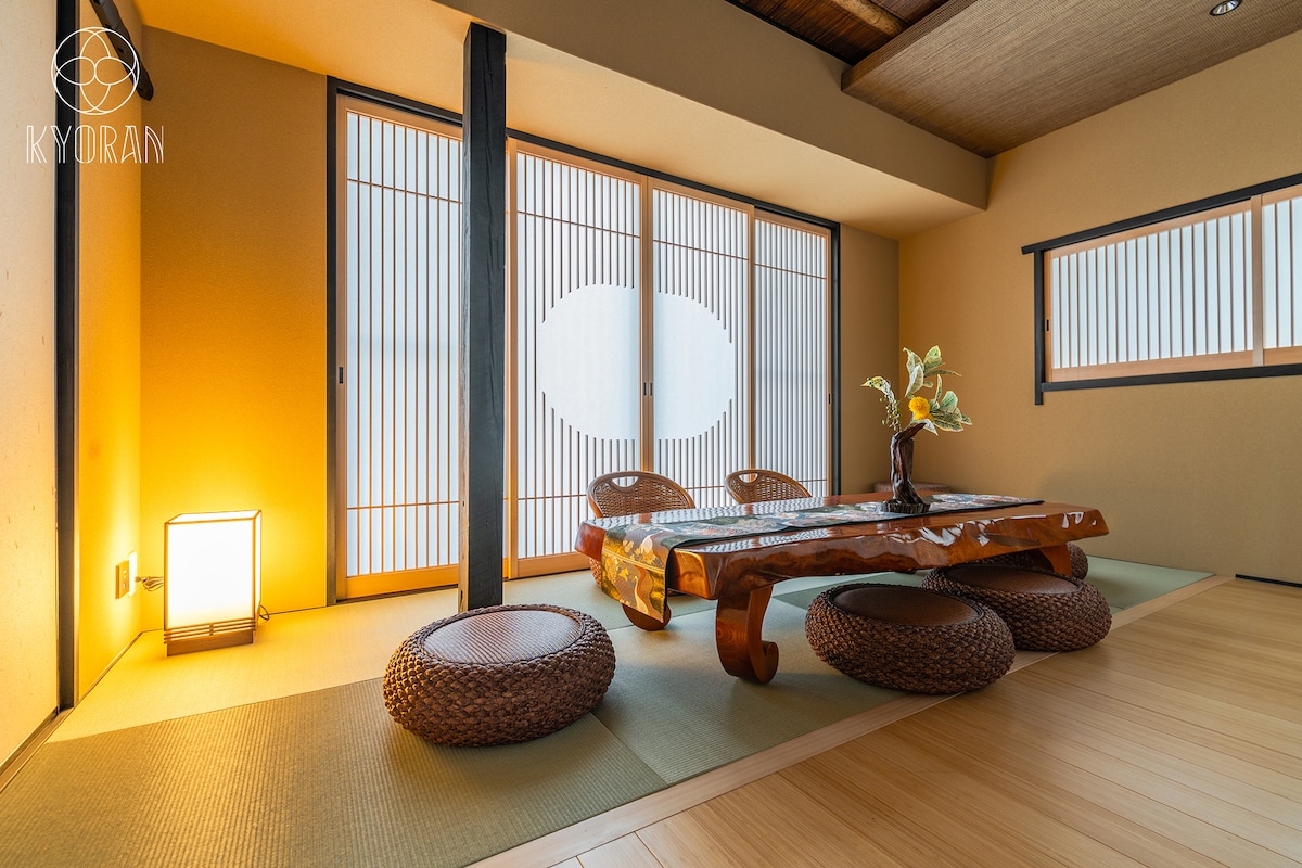 京町家貸切宿「高瀬川七条」は築115年の京町家をフルリノベーションした宿泊施設です。京都の美しい風景を形作る京町家を、当時の構造を残したまま、京都特有の蒸し暑い夏、底冷えの厳しい冬にも快適にお過ごしいただけるよう、気密性・断熱性能の高い建物に仕立て直しました。 1階の和室からは『露地』(※茶室へ通じる庭)をイメージした坪庭をご覧いただくことができます。また、廊下にはゆったりとくつろぎながら坪庭を眺めることができるようソファをご用意しました。夜にはライトアップされた坪庭を眺めながら、癒しの時間をお過ごしいただけます。 2階には寝室が2部屋あり、シングルベッド2台の部屋とダブルベッド1台の部屋をご用意しました。 5名様以上でご宿泊の場合は、少しご面倒ですが1階の和室にお布団を敷き、寝室としてご利用いただきます。 キッチンには簡単なお料理ができるよう調理器具と食器のご用意がございます。