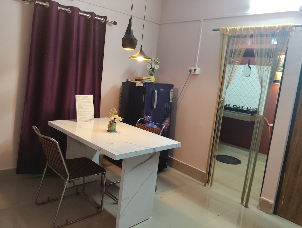 A peacefull and unique place that will make you feel therapeutic. This place is full of love equipped with all the amenities for your comfort. No loud parties and No Loud music after 10pm. Enough for 4-5 people. AMENITIES: -Ground Floor with wheelchair access -Android Project with 8ft*6ft screen (OTTs) -Free WiFi -AC -Fridge -Chimney -Geyser -8 inch soft mattresses -Convertible Sofa-Bed -Gaming Area with Carrom, UNO, Chess etc -Equipped Kitchen -Housekeeping and Caretaker in campus.