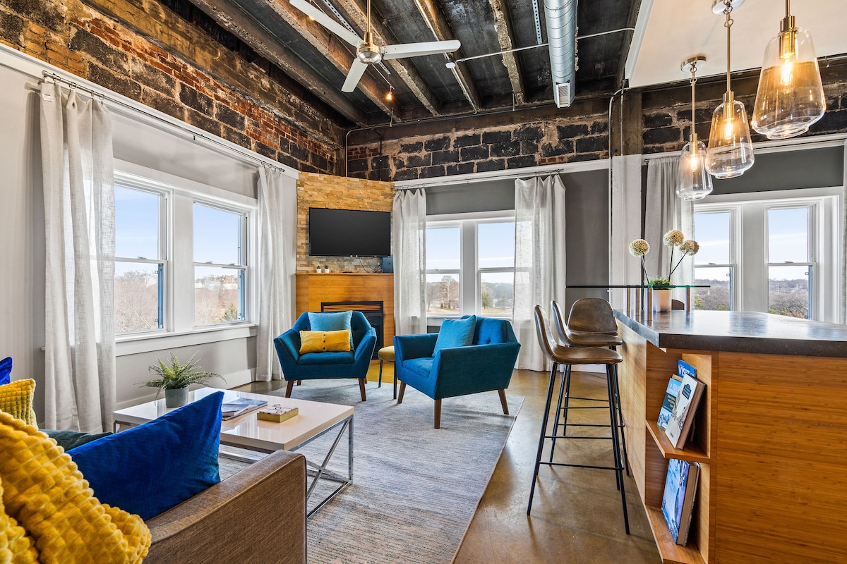 Truly one of a kind Historic property converted into a spacious, cozy loft in the heart of South KC. This 100-year-old space(5 min from HS Truman farm. He spoke on this stage on his first political campaign) has been completely rennovated with concrete countertops, beautifully vaulted ceilings, huge bathroom, built in workspace and even a fun kid's room. Let the natural light pour through the massive windows or close the curtains and dim the lights:) We hope you enjoy it as much as us!