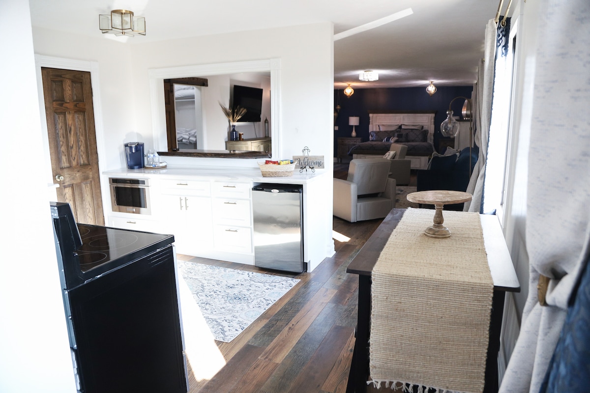 Tucked into a hollow on the eastern edge of Prairiewood's preserve, Cottonwood Suite exudes romance and abundance. Cottonwood has everything you need for a weekend getaway or overnight stay: spacious living quarters, spa-like features including oversized soaker tub, gas fireplace, comfort amenities including hospitality counter with mini fridge and microwave, patio with outdoor seating, and yard with fire pit, hammock, and grill — with easy access to trails, fishing, canoeing, and kayaking.