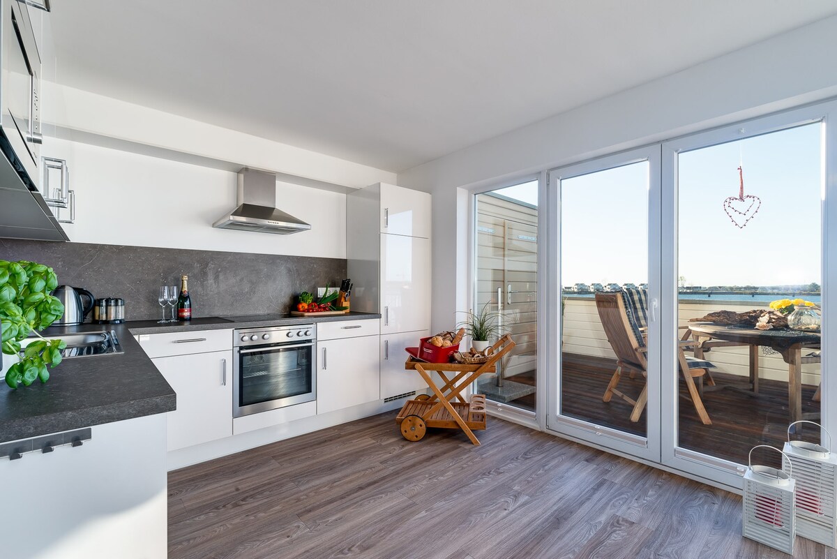 Modernized open and airy apartment with stunning views over Kiel Bay, located right by the Kiel Schilksee Marina. The "bedroom" is a half-height lounging area (no standing height), which can be reached via a small wooden ladder/staircase. Also from the bed you have a great view of the water. There is also a TV corner. 1 car parking space in a parking lot secured with a barrier is at your disposal.