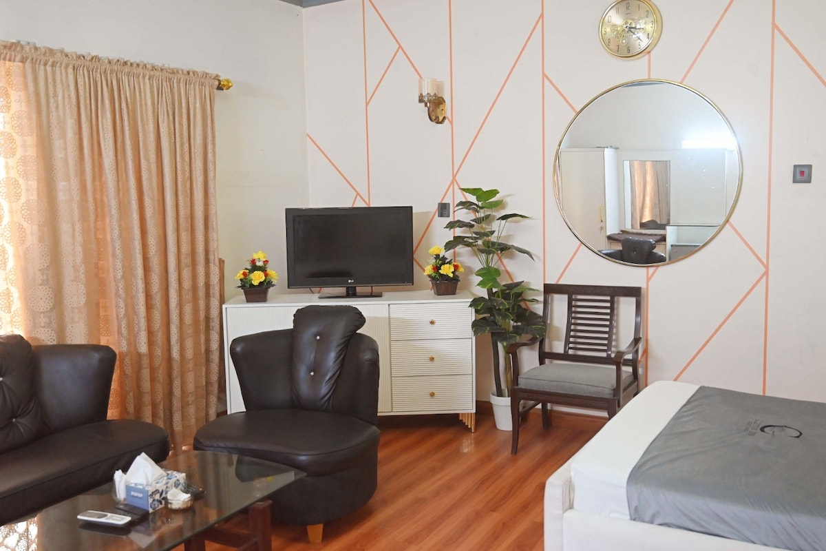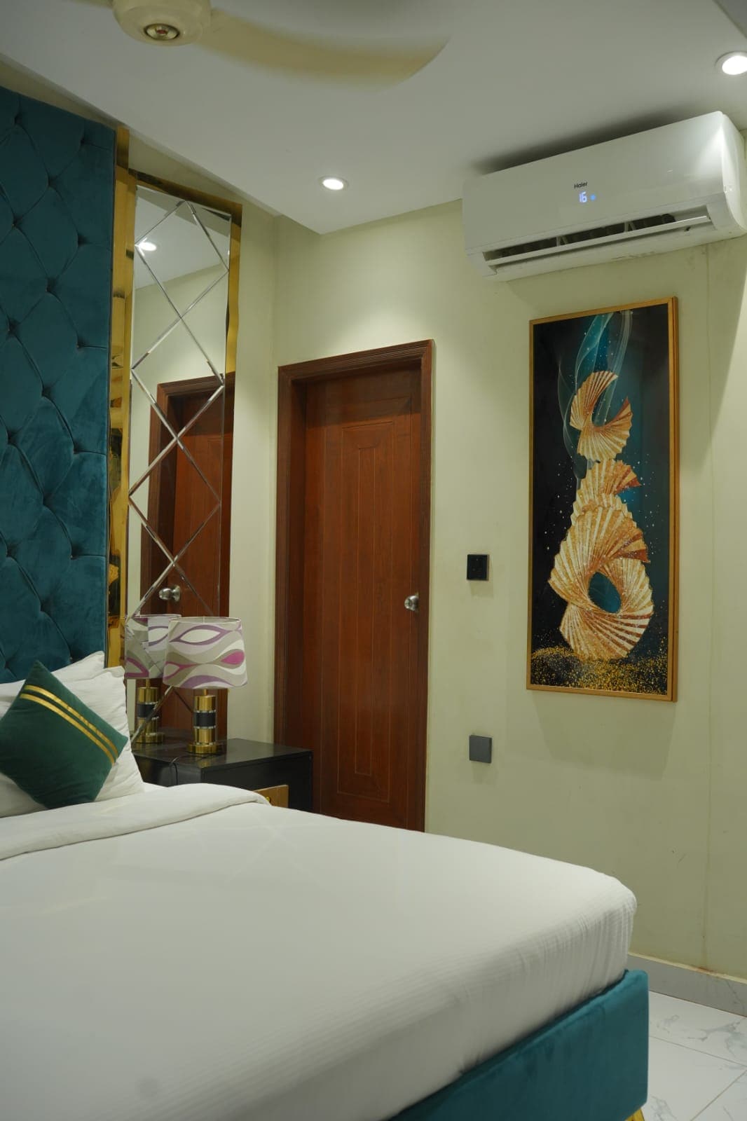 Spacious Executive Suite in DHA Phase 8 with an upgraded boutique finish and extra comfort. King bed, sitting area, fast Wi-Fi, smart TV, minibar/fridge, safe and a luxury ensuite—perfect for longer stays and work travel. 24/7 support; RFID key-card access at check-in.