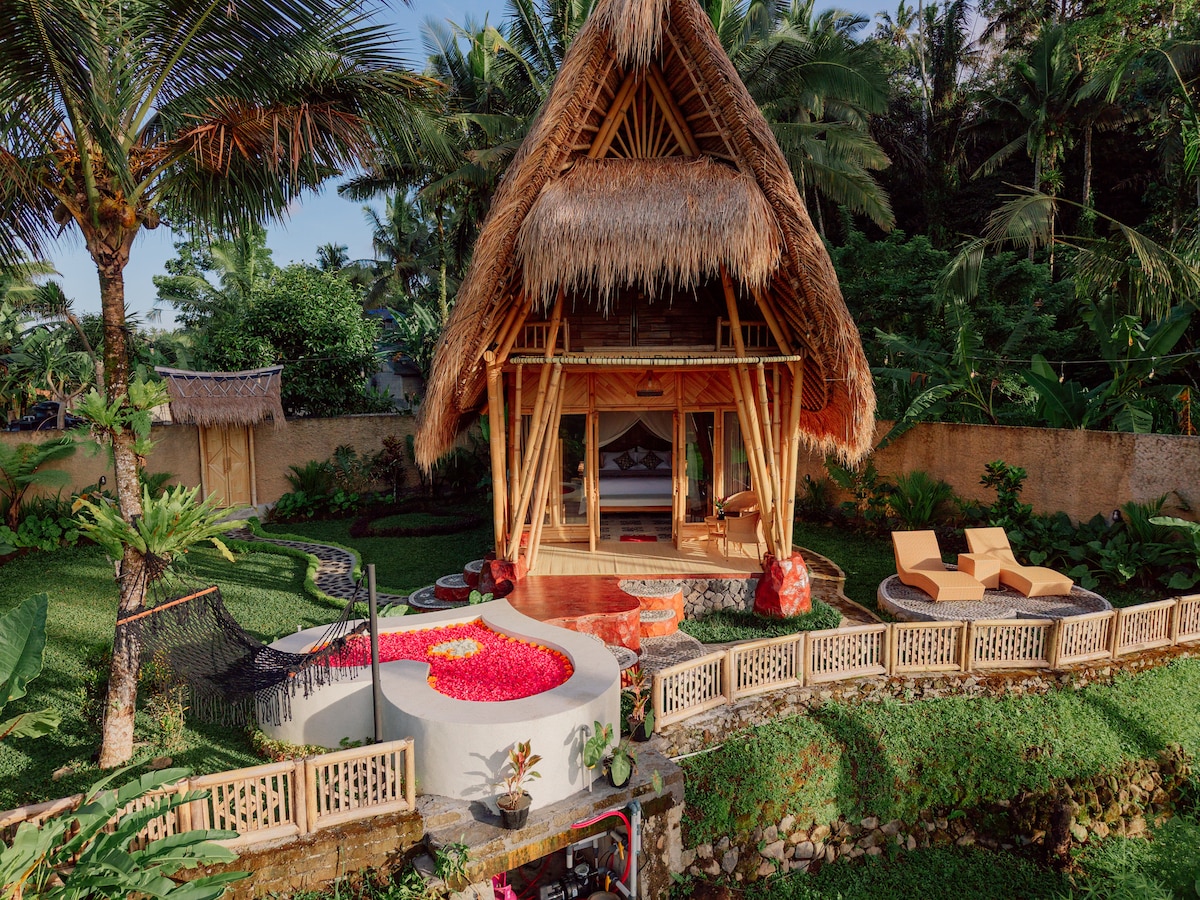 Angel Bali Suites is a special design bamboo house with private open air bathroom. You will definitely get a memorable experience while staying at this charming and unique place. The beauty of traditional bamboo art with stunning natural scenery. Friendly and satisfying service will always be remembered. Very good for finding peace and tranquility of the soul. The radiance of Love and Nature's love will give vibrations to the inside while soaking in the warm Jacuzzi water so enjoy yourself.