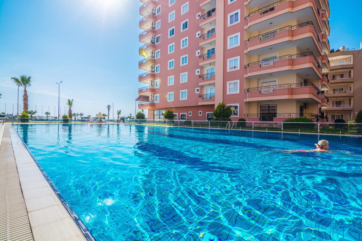 Lovely Beachfront 1 +1 Apt. Lexus Residence (70m2) New Furnitures, Beach access and sea view. All season full activities with big balcony to enjoy your morning coffee and meals Smart Key Self Check in 7 km to Center & 35 km to Gazipasa Depending on season large indoor & outdoor pool, Fitness, Water Slide, Tennis Court, Game room, Cinema Salon, Children's playroom. Party room, BBQ area & 7/24 Security (Turkish Bath, Sauna open on weekends) Best enjoyed by couples & Families.