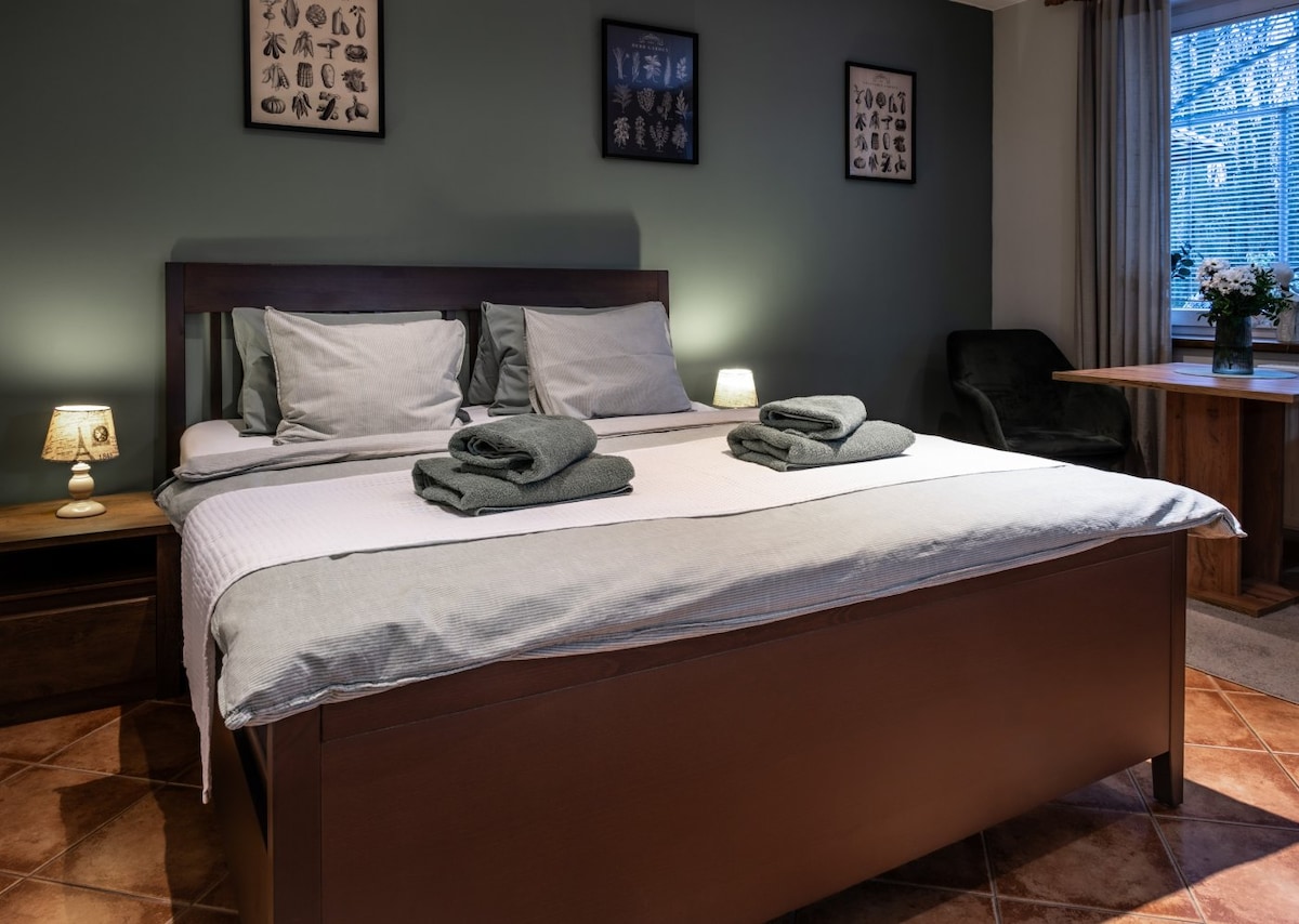 Apartment room for two people with a separate entrance and a large window to the garden. Room features a kitchenette with refrigerator, microwave and kettle.