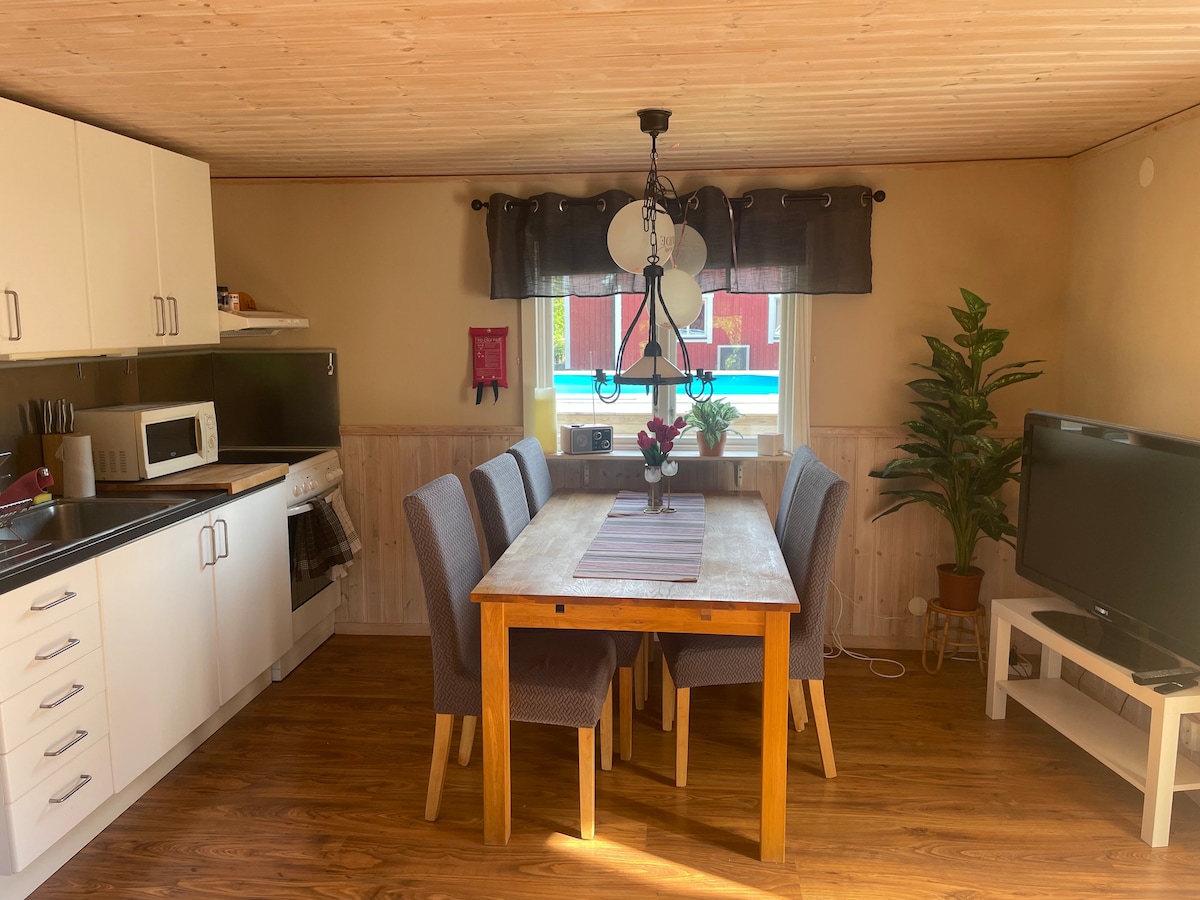 A cozy and pleasant ground floor apartment with AC and private patio. Fully-equipped kitchen, two comfortable beds and an extra bed (130 cm wide) in the sofa. Toilet with shower and washing machine as well as fridge and freezer allows you to stay a little longer with self-catering. Good WiFi and TV. Bikes for rent and electric car chargers are available. The house is located on the outskirts of a residential area in Nättraby, 10 km from Karlskrona. Swimming area 2 km, store 1 km and nature nearby. In 2026, new houses will be built about 100-200 meters from the house.