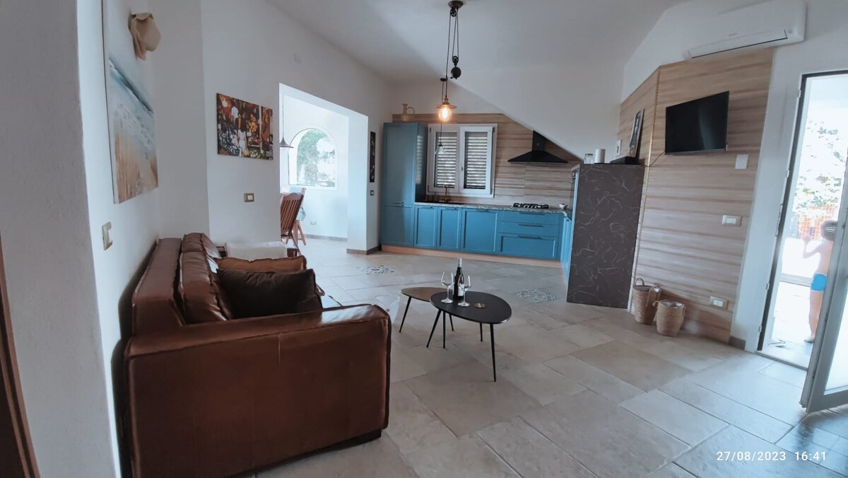 The house is located 5 minutes from the sea. It has a heated Jacuzzi with hydromassage and is composed of a large and bright living room with sofa bed and TV, large equipped kitchen, two bathrooms, double bedroom with panoramic view, smart working corner, a large panoramic veranda overlooking the sea and garden with sea view . Other Services: air conditioning, heating, washing machine, TV, microwave, coffee machine, video intercom, WIFI, automatic gate, internal and external shower and parking