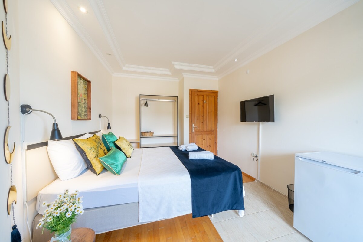 Features of Room Meis; . 3-Room Meis Ful has sea view and Kas view. It is close to the most natural and beautiful beaches of the Kas region. 4-It is a 2-minute walk from the famous Ancient Theater of Kas. . 5-You can sleep at night without being disturbed by the noise of Kaş in our hotel located in the center of Kaş. 6-You are in a very natural and natural area.