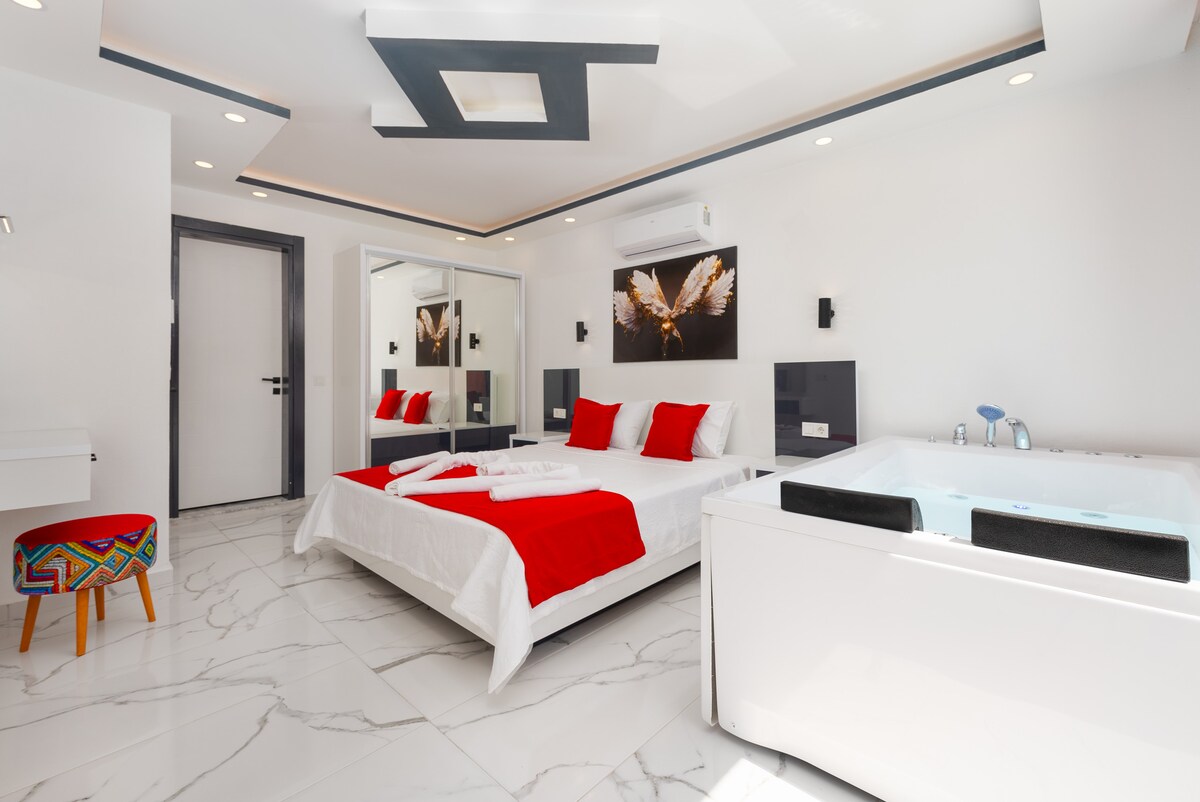 Villa Kısmet, located in the Kalkan Kördere Region of Kaş, Antalya, has 2 bedrooms and a capacity of 4 people. You can enjoy your holiday with a magnificent panoramic sea view. Our villa has a jacuzzi in the bedroom. There is also a pool jacuzzi and a shallow pool. You can also enjoy great meals at the barbecue on the pool terrace. It awaits you for an unforgettable villa vacation.
