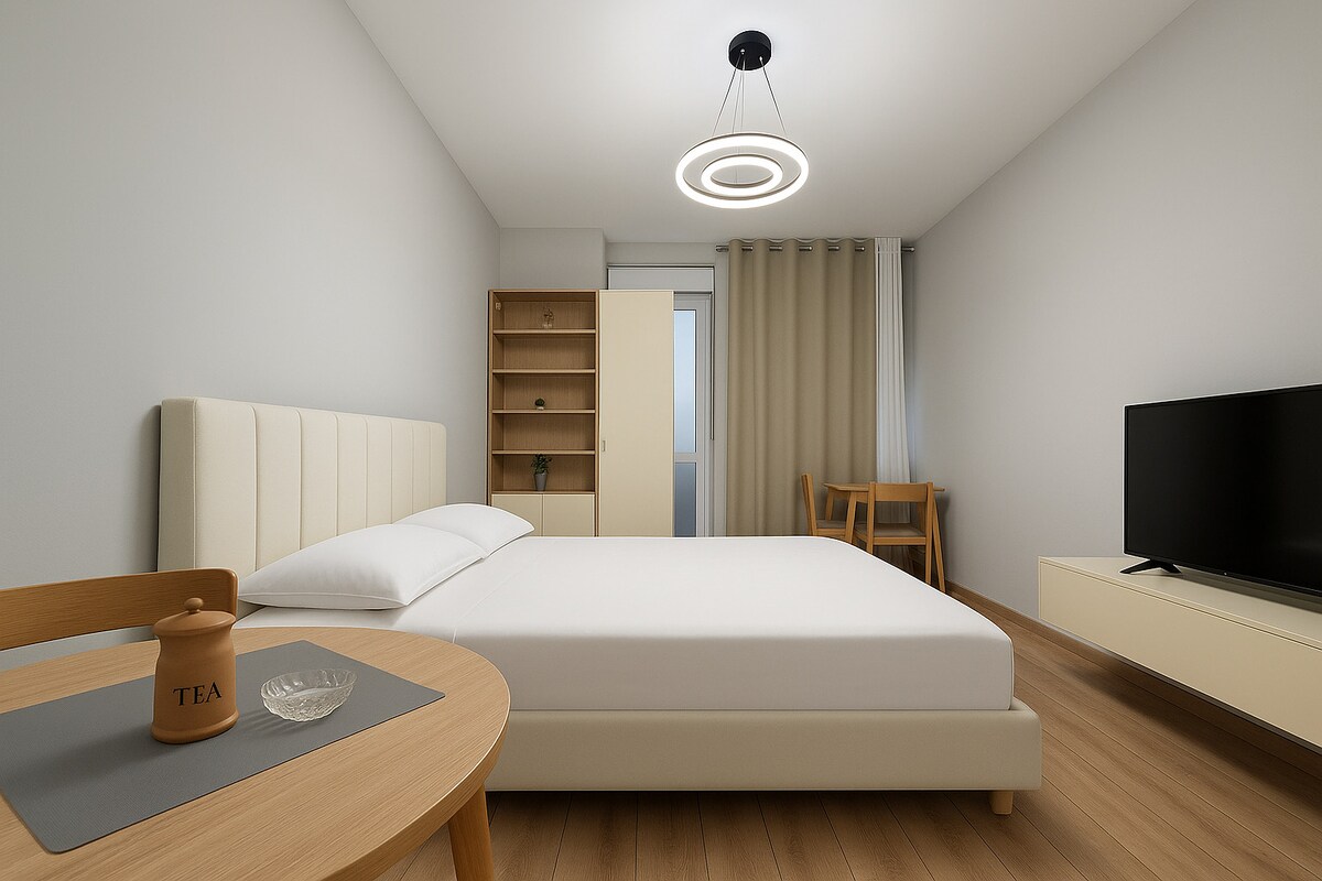 This cozy studio apartment in Myslym Shyri, Tirana, offers a prime location near Skënderbej Square and Blloku. The space features one multifunctional room with a comfortable bed, a small dining area, and a kitchenette equipped with essential appliances. The modern bathroom includes a shower and toilet. The apartment provides a perfect blend of comfort and convenience, ideal for exploring the city's cultural attractions and vibrant nightlife.