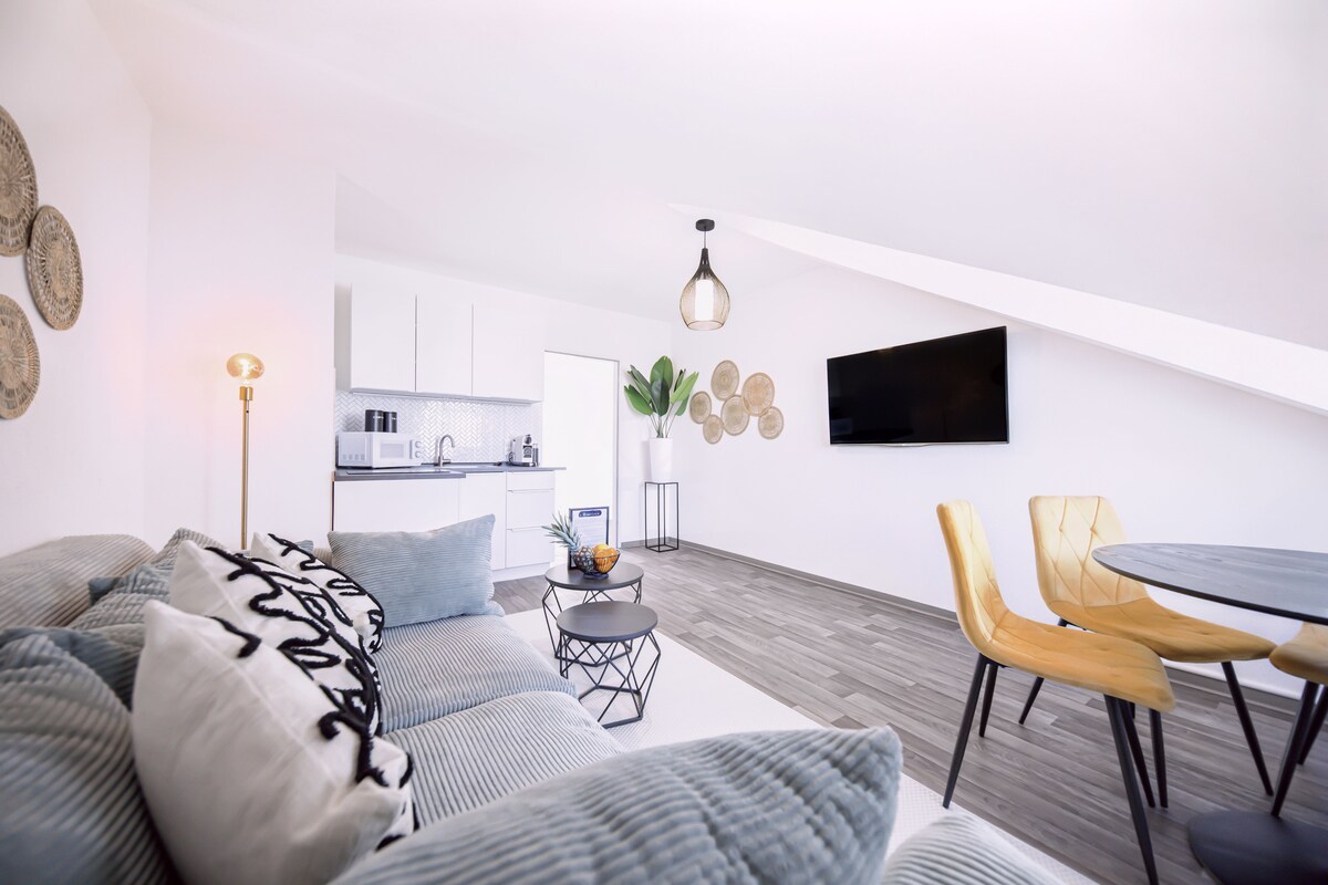 Welcome to our Himmelsstürmer Apartments! This modern apartment features large windows, stylish design, and plenty of light. The living area sofa can be converted into an extra bed. The kitchen and bathroom are fully equipped, and the bedroom’s box-spring bed with blackout curtains ensures restful sleep. High-speed Wi-Fi, HD TV with Netflix & Disney+, towels and parking complete your stay.