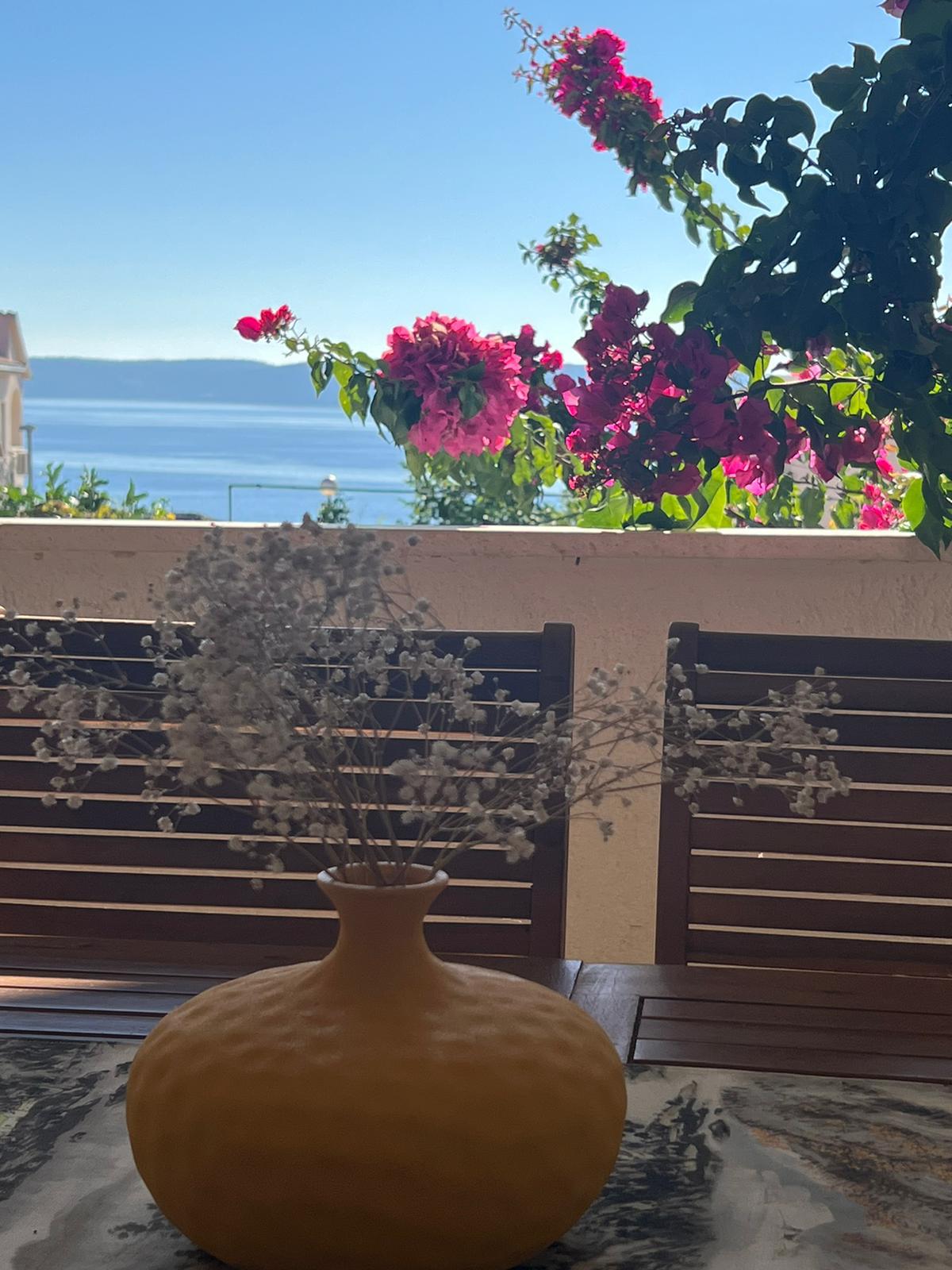 Lovely place. Middle apartment on the second floor. Bit secluded, unlike east and west unit. Amazing view on the sea and distant islands. It has kitchen combined with living area, bathroom, sleeping room with doublebed, plus 1 foldable sofa which can be stretched into a comfy bed. Broad balcony with 2 chairs and a table is a cute place for dining in the summer breeze. Beach is 3 minutes walk from the apartment. Its placed near airport, Split and Trogir. Bus station is below the house.