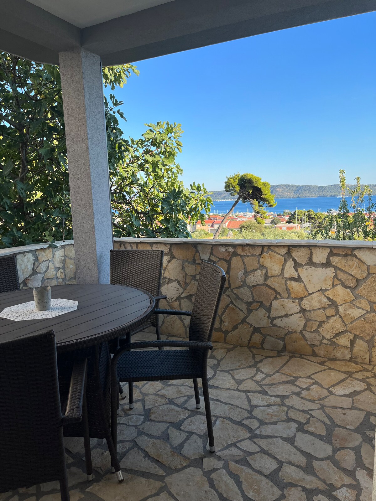 The modernly furnished apartment has a room with a separate air conditioning, TV and modern lighting. The kitchen is equipped with dishwasher, ceramic plate, microwave and all the equipment. The living room has sofas for a third person and its tv and air conditioning. The apartment has a beautiful terrace overlooking the sea, ancient Salon and Split. Guests can use our swimming pool and barbecue in the garden.