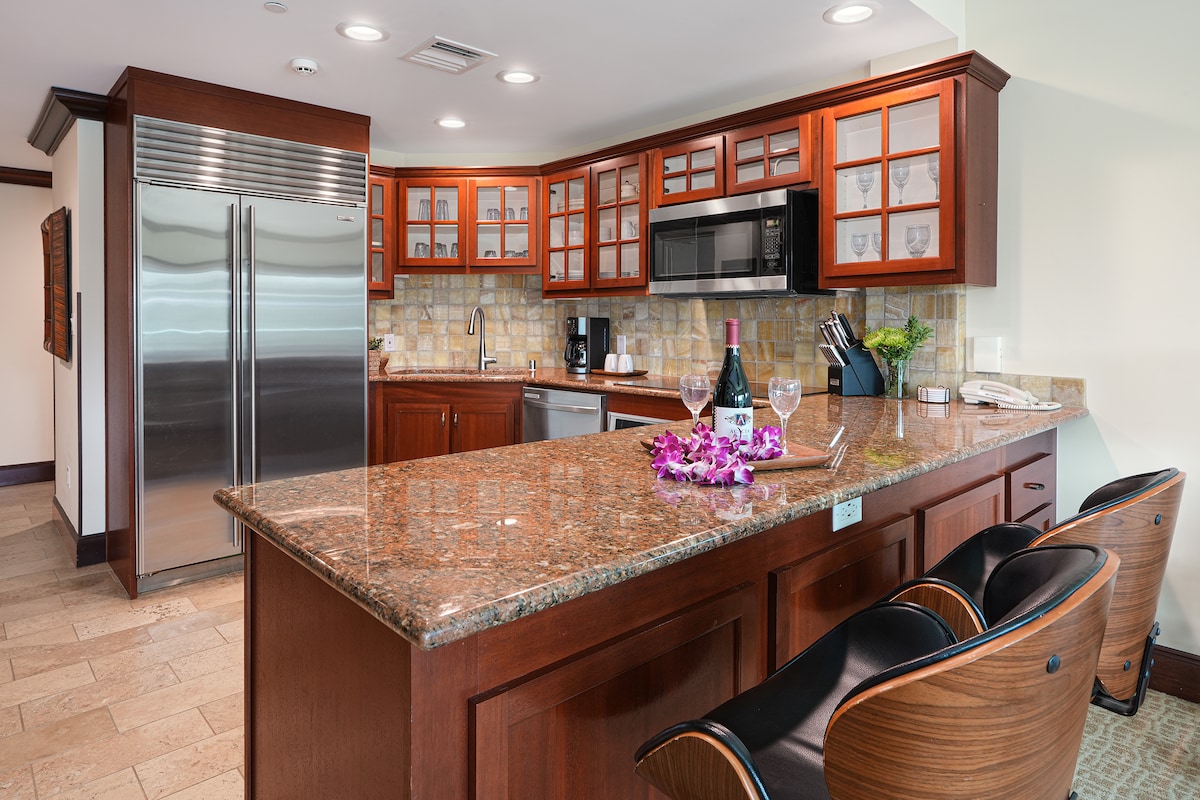 Escape to paradise in our one-bedroom suite at Kauai Beach Villas. This spacious villa is located at Garden Isle, perfect for couples or small families. Enjoy a king-sized bed, a queen sleeper sofa, and a fully equipped kitchen for easy meals. Guests love the private lanai with breathtaking views, which are ideal for unwinding after exploring. With direct beach access, resort pools, hot tubs, and lush tropical grounds, you’ll have everything you need for an unforgettable Hawaiian getaway.
