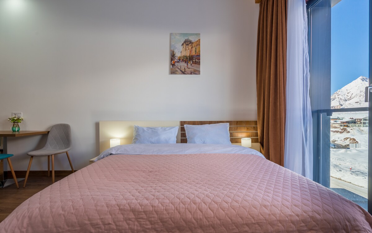Home with Soul in New Gudauri's heart! A perfect way to spend holidays, or enjoy skiing and boarding all season long. The place is newly renovated with breathtaking views. The balcony overlooking the mountains and a ski road. Home is located on the edge of the ski slope, just 100 meters walk from the gondola base, ski in/ski out access to slopes/ We will do our best for your comfortable stay!