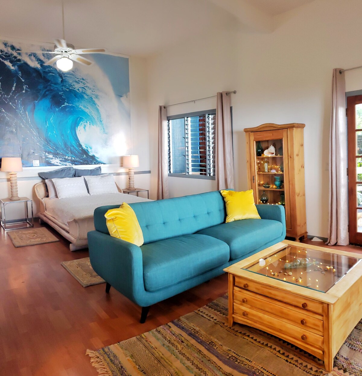 Designed by Twin Islands Interior Design Group - Escape to Big Island and indulge in the tropical paradise of Hawaii with this charming 1 bedroom, 1 bathroom Airbnb property. Enjoy an ocean view from your breezy porch and sleep peacefully in a comfortable queen-size bed. AC unit in apartment, evenings and mornings are cool due to elevation. Spend lazy afternoons on the porch and soak up the jungle energy. Experience the magic of Big Island Kealakekua for yourself!