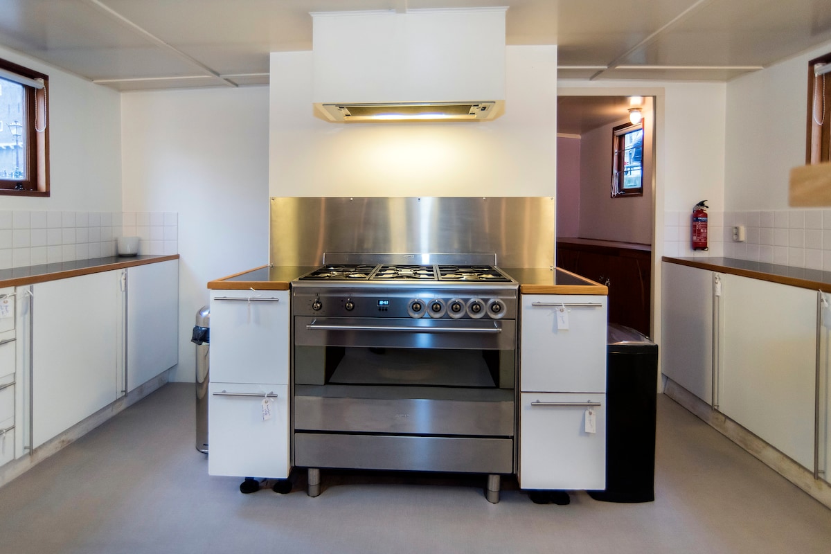 Romantic Houseboat in the Heart of Amsterdam Lovely boat, lovingly renovated with great attention to detail — the perfect hideaway for a romantic couple. One cozy bedroom plus an extra double bed/lounge in the front (a real bed with two quality mattresses, see pictures). In the middle of town, yet dreamy and quiet: look up from your bed into the crown of a tree 🌳, or enjoy stunning canal views from the steering cabin. The Fully equipped with all comforts: WiFi, A/C, washer & dryer, dishwasher.