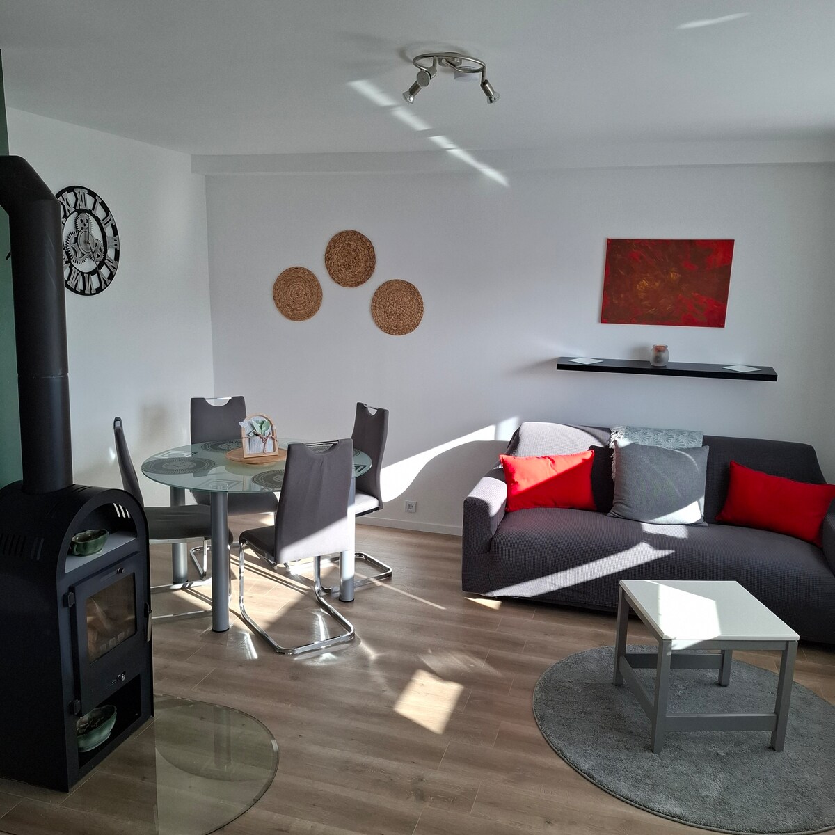 Panoramic 60 m² apartment – for up to 4 guests • King-size bed, sofa bed, folding bed (on request), baby crib • Fully equipped kitchen: stove, oven, kettle, coffee machine, dishwasher, fridge, TV • High-quality linens, towels, coffee & tea • Large terrace with sun lounger, nature view Great location: • 5 min by car / 30 min walk to Idstein center • Hiking trails start at the door • 20 min to Frankfurt Airport & Wiesbaden • 2 km to autobahn • Nearby playground & top grill restaurant