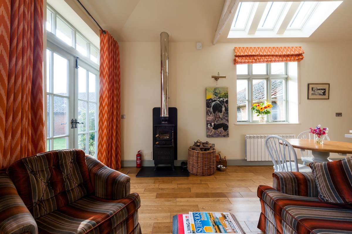 The Stables is in a beautiful peaceful part of Suffolk, on the River Deben, with footpaths, wild swimming, pubs within walking distance, birdwatching, views for artists, and fabulous lanes for cycling. Perfect for paddle boarders and kayaks too. The Stables have been converted into a cosy country cottage with contemporary furnishings, fitted kitchen, bedroom with super king bed, en suite bathroom, shower room, wood burner, 2 TVs and wifi, books and games, and tennis court (by arrangement).