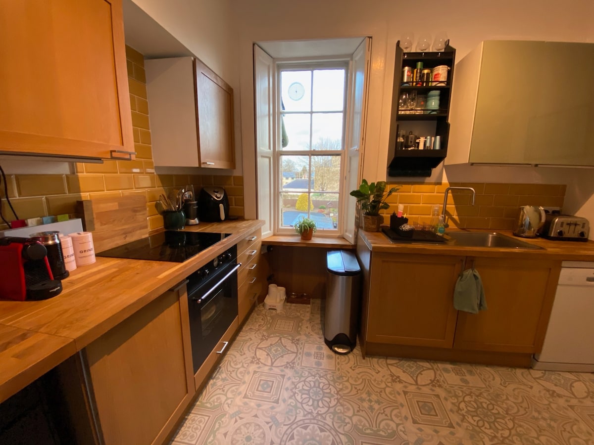 Freshly renovated flat in Hawick with perfect location to explore Scottish Borders. Very spacious, bright and airy, but cosy at the same time. Fantastic views, log burner and traditional features. The accomodation is centraly located near to the Town Hall, very close to the High Street with walking distance to cafes, restaurants, shops and tourist attractions. Book a minimun of 3 night to receive a basket of snacks. Book 7 night or more to receive a breakfast pack and a bowl of fresh fruits.