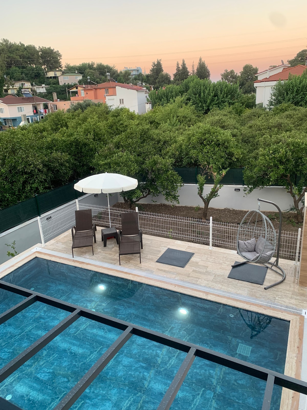 The villa is private. It has its own private pool. There are sun loungers and a swing where you can relax by the pool. All kitchen utensils in a house are available in our villa. (including the latest model barbecue) Our villa has two bedrooms on the upper floor. One has a double bed and the other has 2 single beds. Both bedrooms have their own bathrooms. There is a kitchen, living room and toilet on the ground floor, and we have 2 sofa beds in the living room.