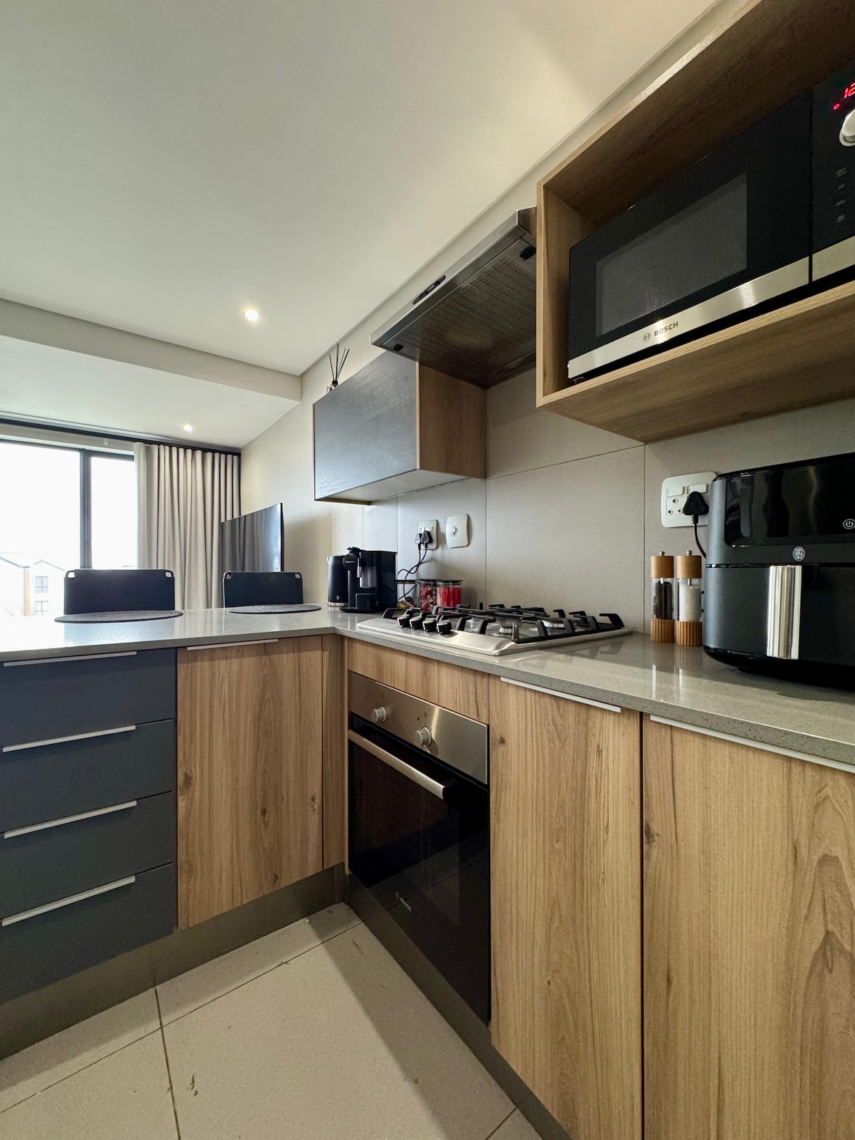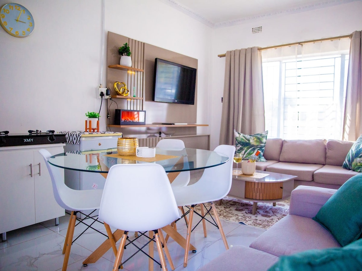 Enjoy a secure and stylish stay in this modern two-bedroom apartment, close to O.R. Tambo Airport. Benefit from 24-hour on-site security guards and convenient 24-hour check-in, ultra-fast Wi-Fi, air conditioning, and UPS-backed power ensuring uninterrupted connectivity and charging during loadshedding. Prepare meals effortlessly with a gas stove and enjoy the comfort of solar-heated showers. Perfect for business travelers and families seeking comfort, security, and peace of mind.