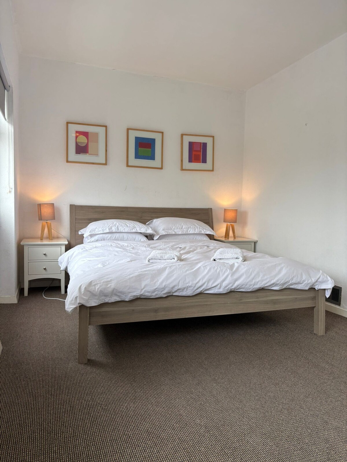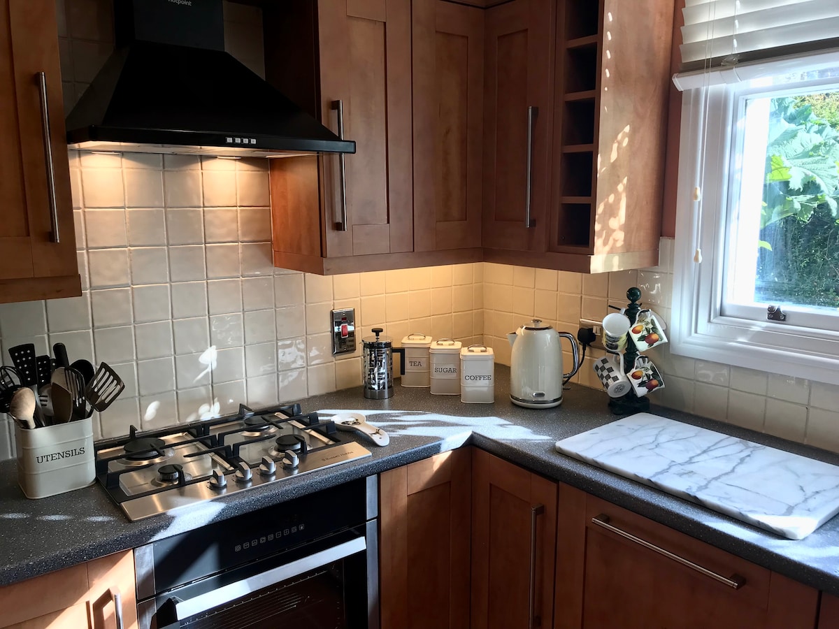 Bright, self-contained annexe on the 1st floor with private entry and lockbox for easy check-in. Features a king-size bed, sofa bed, dining area, and kitchenette with fridge/freezer, toaster, and tea/coffee facilities (no hob/oven). Mezzanine with two single beds, accessed by stepladder with lockable gate. Modern ensuite with shower and fresh towels. 42” TV with Netflix (no terrestrial TV). Private parking for 2–3 cars. EV charger available on request for a fee.