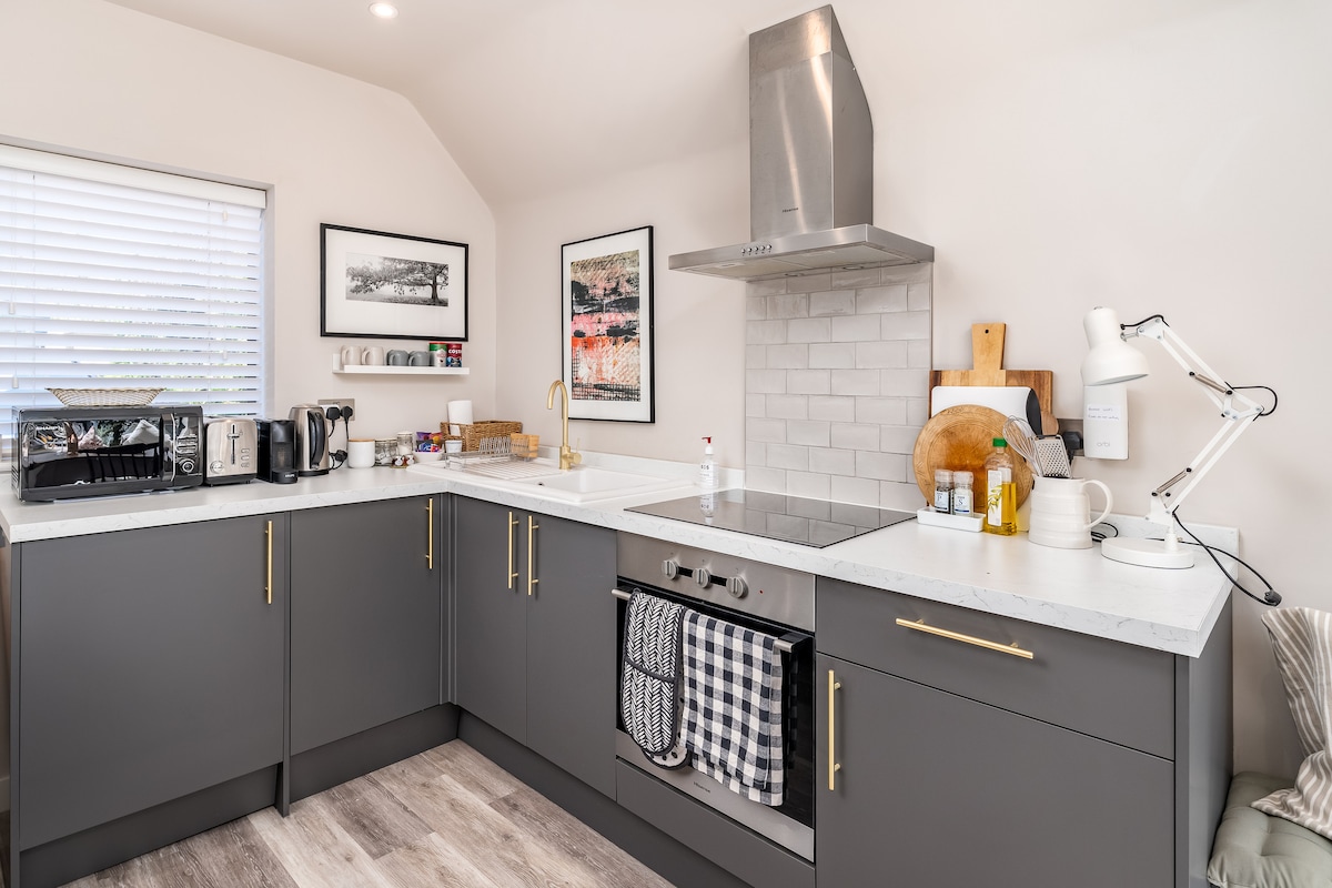 The Lodge is a separate building from the main house and has a private patio for relaxing in the sunshine or stargazing at night. The double doors from the patio, lead you into the main, open plan kitchen / living room / dining area. There is a sofa bed with large TV with immediate access to Netflix, iPlayer etc, and super fast WiFi. There is a downstairs loo. Upstairs there is a double bedroom with en-suite bathroom and shower. It has all the amenities for a comfortable and relaxing stay.