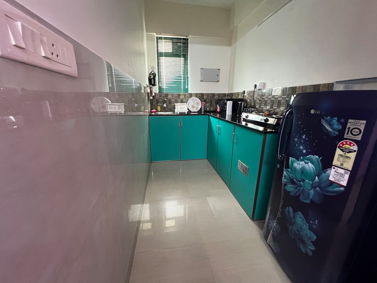 Central A/C Premium apartment with 5bedrooms (1King+ 4Queen-all orthopedic mattresses), all attached bathrooms •Living space with 56" google TV, FREE WIFI, 8 seat dine. •Kitchen with- 4 hob electric cook top, hood, grill, microwave, fridge, rice cooker, kettle, toaster, blender, cooking and serving utensils, dish washer, breakfast table with 2 seats. *COMPLEMENTARY TEA/COFFEE/MILK & BISCUITS. DON'TS • NO SMOKING • NO MASALA COOKING • STRICTLY 10 GUESTS MAX