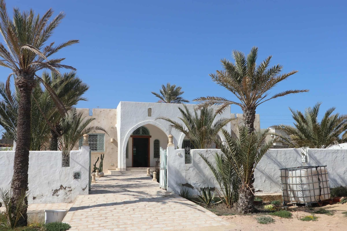 This peaceful home offers a relaxing stay for the whole family. It is located in the historic village of Farhat Hached and Habib Achour. It is a 2-minute walk from the only Archipelago Museum relating to the traditions and heritage of the Kerkennah Islands. It offers a view of the only saltworks present and the fields of olive trees, palm trees and prickly pears. The sea is visible from both sides: north and south. It's really a quiet and serene place to visit the archipelago and enjoy its beaches