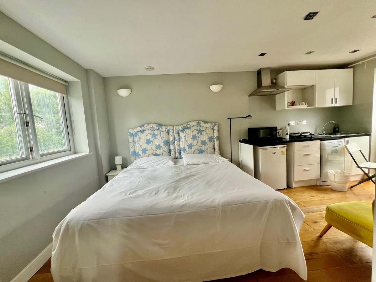 Private studio room with luxury shower room. Nice double bed, extendable dining table with chairs, kitchenette with microwave, kettle, toaster, one ring table top induction hob, Airfryer, fridge with freezer compartment. Smart TV, big window for great daylight, ceiling fan for hot days. New shower room walk in shower, sink, wc and separate washer and dryer. All for private use in West London Rentals.