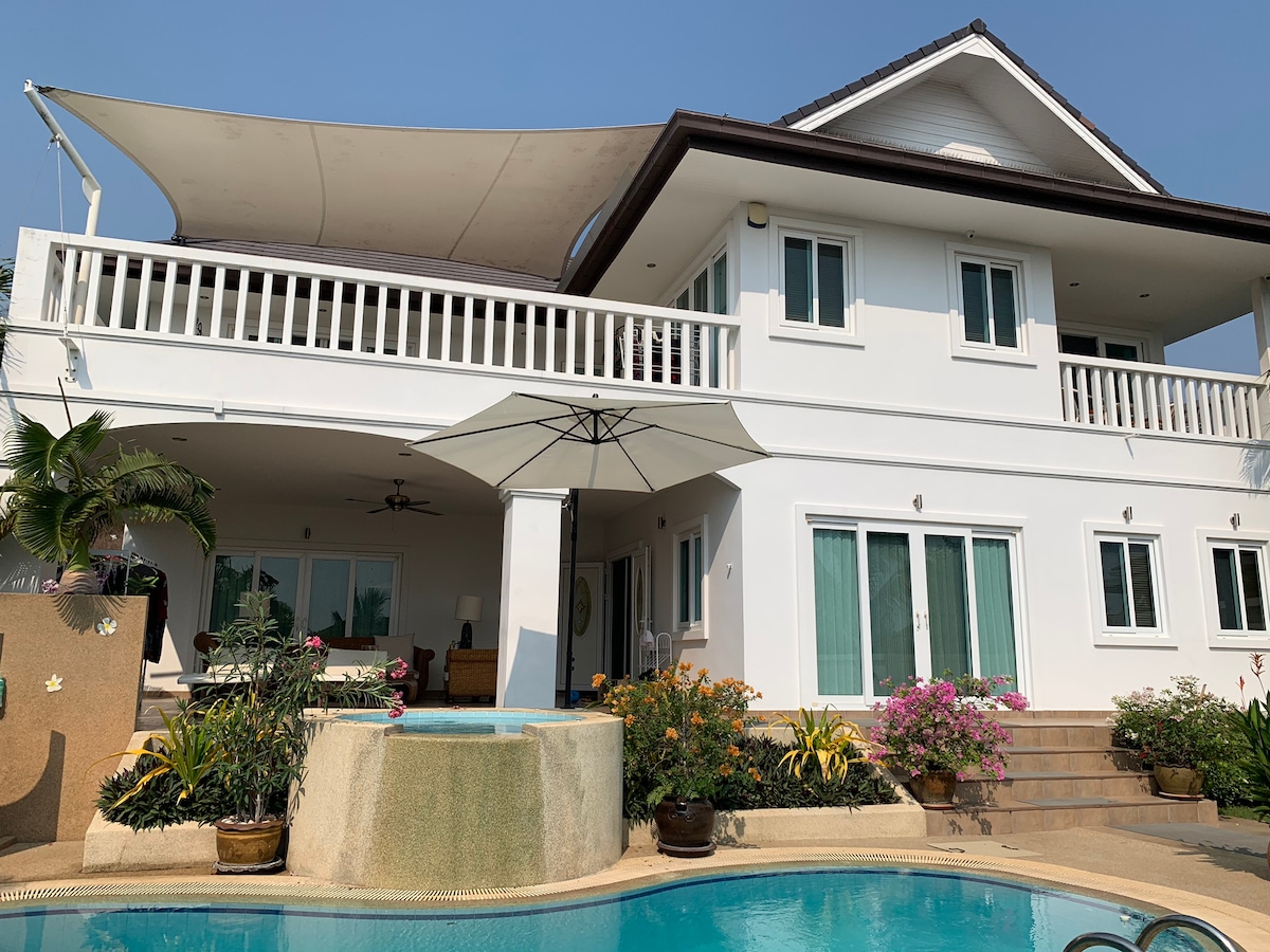 (ALL INCLUSIVE PRICE) Lux mansion in exquisite villa compound (24h security) in Sai Noi beach area (100m to Phetkasem rd).Elevated (garden 3m above private rd) hillside 2floor villa (3 bedrooms and 4 bathrooms; full A/C), lush private garden, pool, and 2x Jacuzzi.Immersed in nature, always enjoys fresh breeze, mountain and sea views.4'drive to Sai Noi and Khao Tao beach, 6'to Sea Pine beach and majestic Ratchapakdi park.10'drive to downtown.Ideal relax for family, friends and couples.