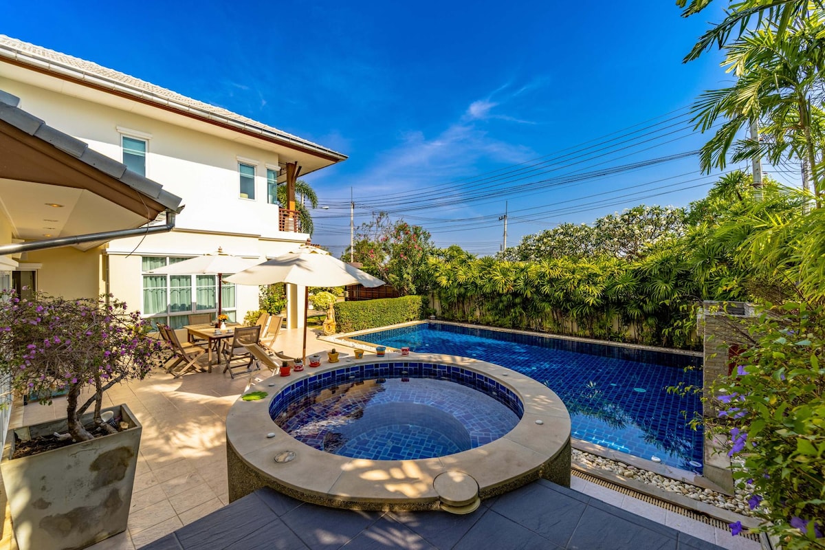 A new, romantic, cozy, clean & safe home, family- and office-friendly. Big Jacuzzi for 6 people!! Very convenient, full air-con, good mattresses, several shady terraces, BBQ possible, washing machine, hot water, Netflix ... It is placed in a relaxing and quiet village, just 5 to 10 minutes from … - town center - beautiful beaches - shopping malls - tourist attractions - hospitals Also check out our other 5-star holiday homes: airbnb.com/h/huahincityloft ... and: airbnb.com/h/city88home