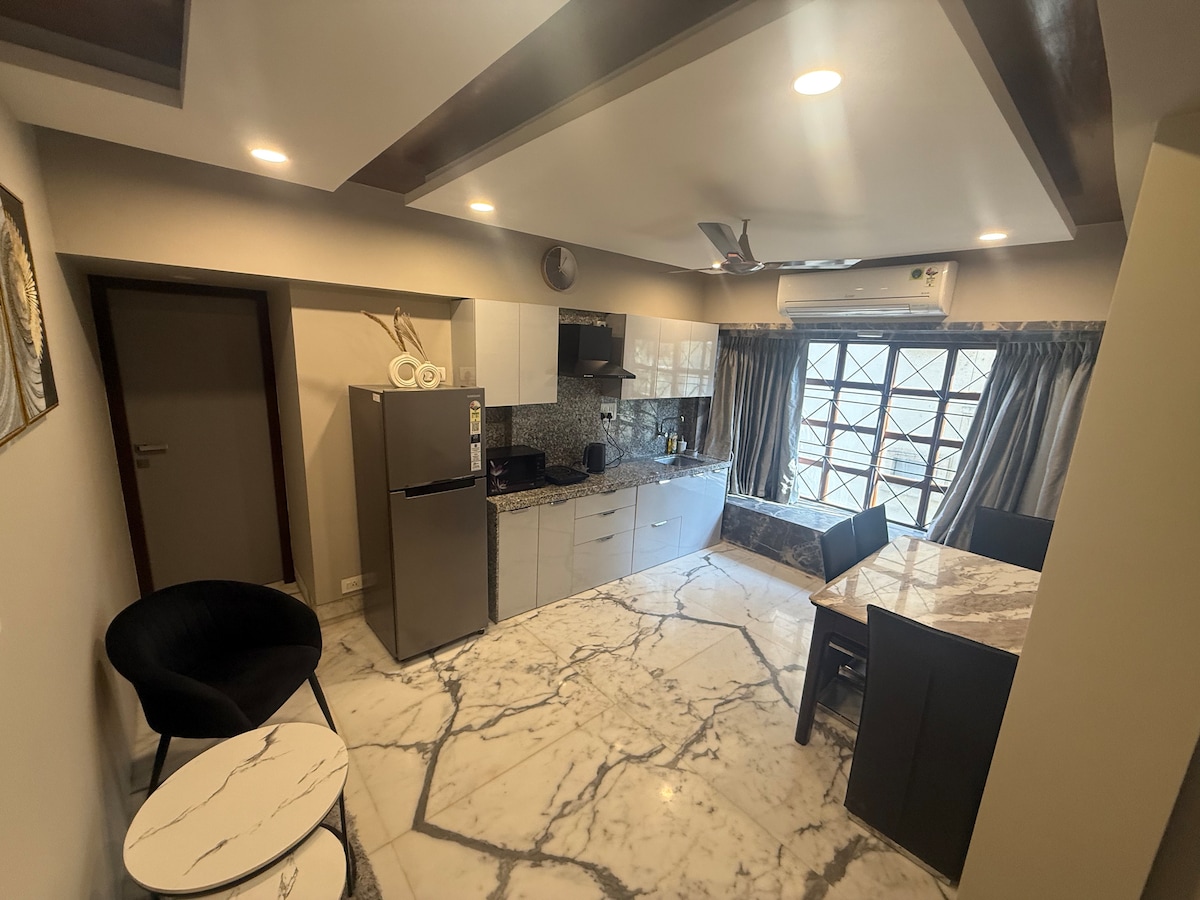 Experience comfort at Marita Apartment an executive 1-BHK on the ground floor near Carter Road. Steps from the ocean, it features a private garden patio, car/bike parking, queen bed, sofa bed, Smart TV, Wi-Fi, and a full kitchen. Located in a quiet, secure area near Rizvi College, it offers great value with easy access to city life. Just a short walk to Rizvi College, beachside strolls, cafes, and shopping. Ideal for Work or leisure with all modern comforts included.