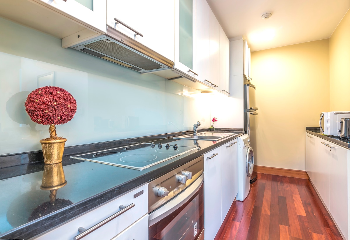 The whole group will enjoy easy access to everything from this centrally located place. Less than 10 minute walk to BTS Skytrain. You will enjoy this large 1 bedroom apartment on 17th floor with balcony. The bed is king size with luxury bathroom with bath tub. The kitchen is equipped next to spacious living room with a washer. You can access to the pool and gym and have a parking lot on premise.
